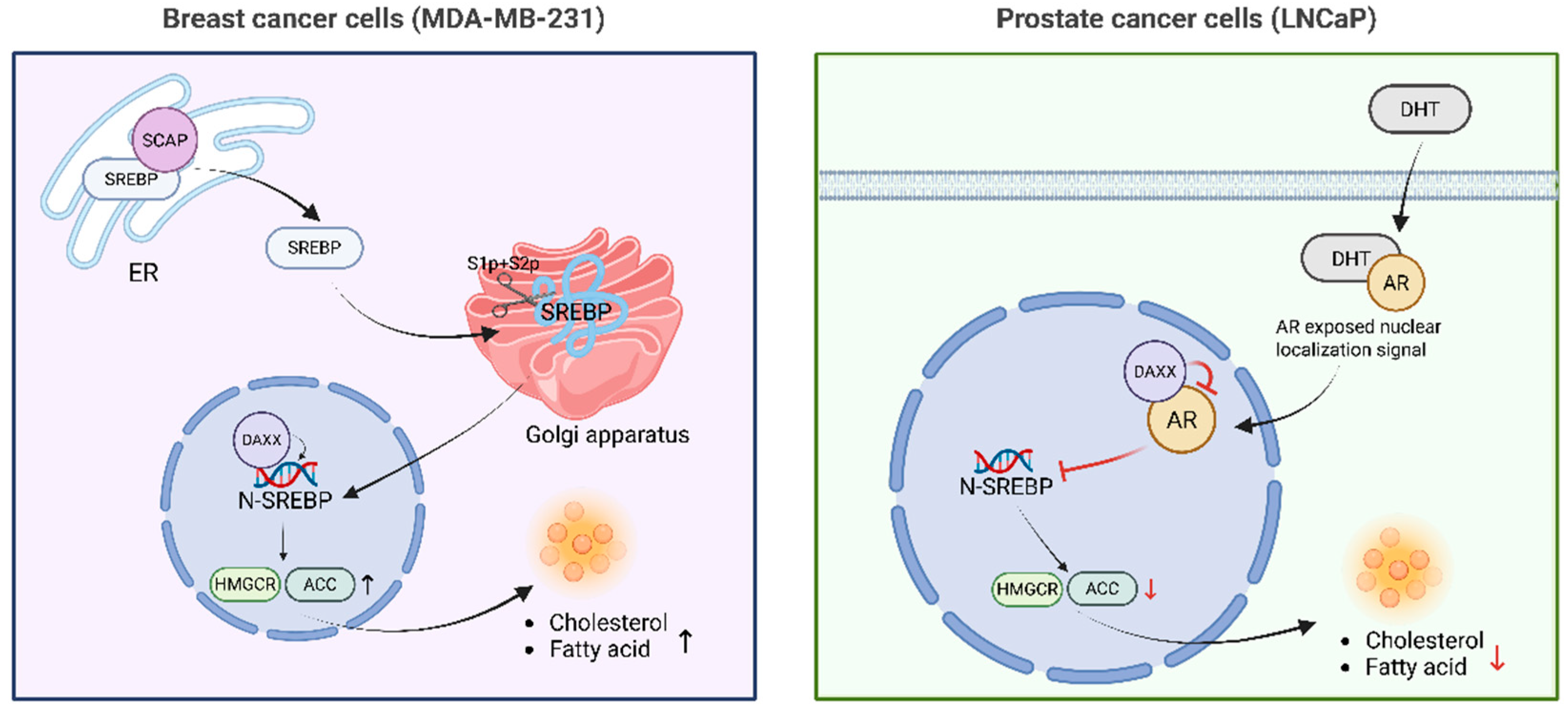 | AR | Physical interaction | Lipid metabolism | Inhibits SREBP2 activation and reduces downstream synthetic genes. | SUMOylation | [28,49,50] |