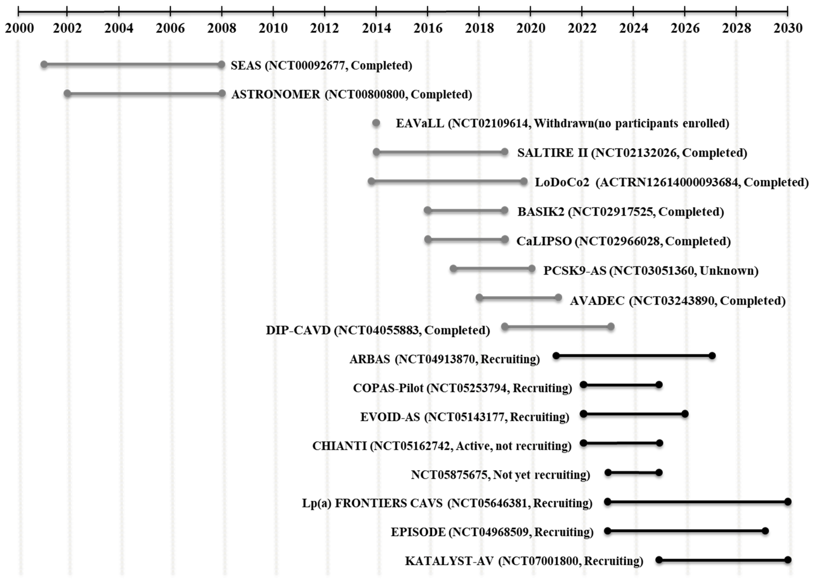 | 10 | Lp(a) FRONTIERS CAVS (NCT05646381) | Mild–moderate calcific aortic valve stenosis with elevated Lp(a) | Phase 2 Recruiting | 502 (Estimated) | Change in peak aortic jet velocity and CT-measured aortic valve calcium score over 3 years | Novartis Pharmaceuticals |