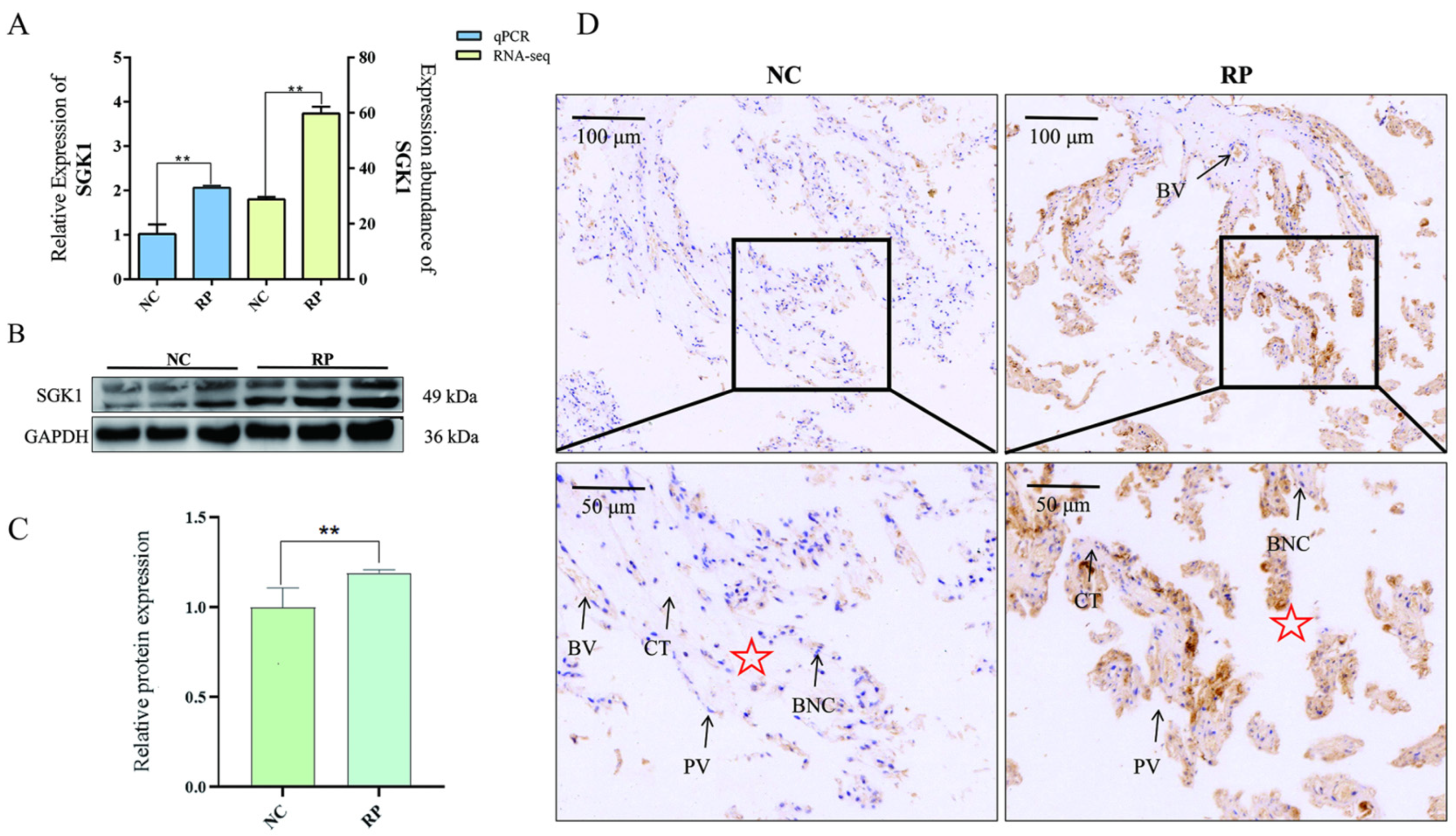 3.2. SGK1 Expression Is Elevated in RP Fetal Cotyledonary Tissues in a Preliminary Cohort