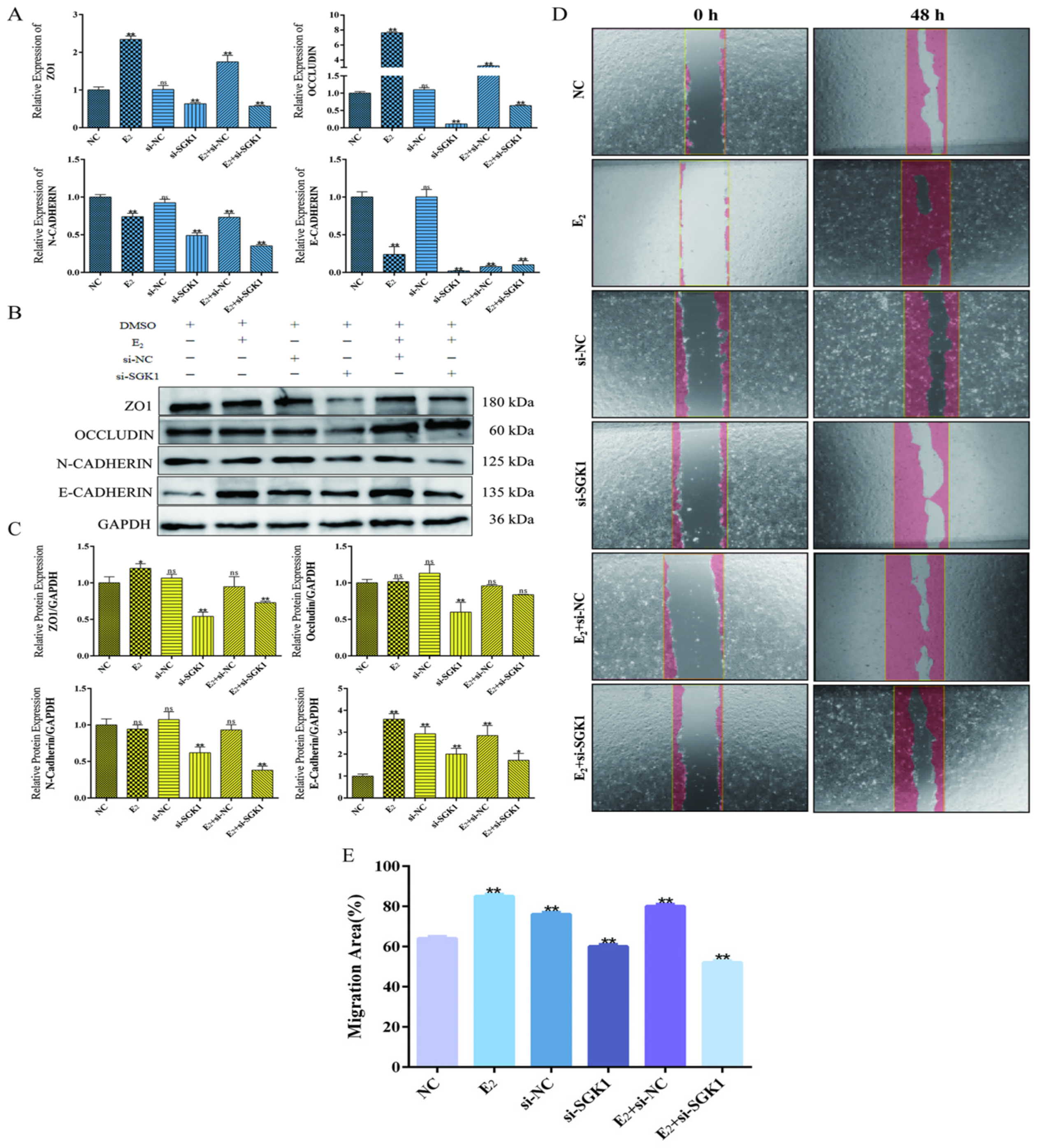 3.8. SGK1 Is Required for E2-Modulated Expression of Tight Junction Proteins, EMT-Associated Marker Changes, and Migration in BEND Cells