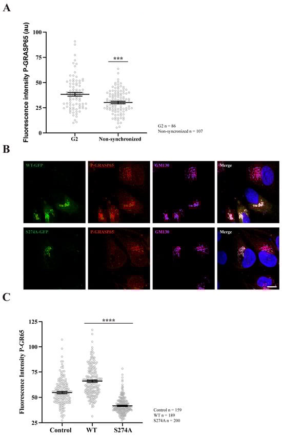 GRASP65 phosphorylation increases during G2 and after transfection with GRASP65-WT but is reduced in cells transfected with GRASP65-S274A. (A) HeLa cells, either synchronized in G2 using a double thymidine block or left unsynchronized, were fixed and stained with P-GRASP65 and GM130 antibodies. P-GRASP65 fluorescence intensity was quantified and normalized to GM130. In non-synchronized cells, the fluorescence intensity was 20% lower than in cells synchronized in G2. (B) Unsynchronized cells were plated and, after 24 h, transfected with EGFP-GRASP65-WT (WT) or EGFP-GRASP65-S274A (S274A). Twenty-four hours post-transfection, cells were fixed and processed for immunofluorescence. Representative images of cells expressing WT and S274A are shown. (C) Quantification revealed a 35% increase in P-GRASP65 fluorescence intensity with WT and a 40% reduction with S274A compared to untreated cells. Representative experiments out of two independent replicates. Fluorescence intensity values are expressed as means ± SEM from 15 broad fields per condition (A) or 40 broad fields per condition (C). In the latter case (C), control cells were non-transfected cells from the same coverslips. Statistical significance was assessed using Welch’s t-test: (A) non-synchronized cells vs. synchronized, p < 0.0003 marked by ***; (C) WT or S274A vs. untransfected cells, p < 0.0001 marked by ****. Scale bar: 5 µm.