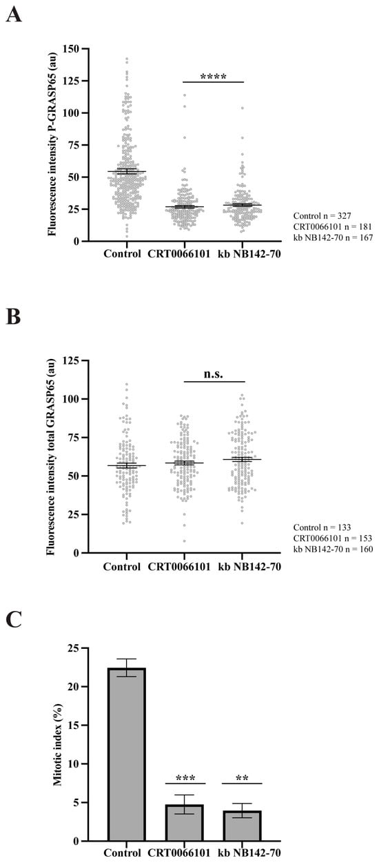 PKD2 and PKD3 are the predominant PKD isoforms expressed in HeLa cells [46,47]. Upon stimulation, PKD3 undergoes PKC-dependent translocation to the plasma membrane, followed by enhanced accumulation in the nucleus [48]. Accordingly, our study focused on PKD2, as it can localize at the GC [34]. To examine the role of this kinase, we synchronized HeLa cells and treated them with two structurally unrelated PKD inhibitors: CRT0066101 and kb NB142-70 [49,50]. Immunofluorescence analysis using antibodies against GM130 to label the GC and anti-P-GRASP65 revealed that both inhibitors caused a 50% reduction in P-GRASP65 fluorescence intensity compared with the control (Figure 4A). As a control, the treatment with CRT0066101 did not modify PKD levels (Supplementary Figure S2C). To rule out the possibility that the attenuation of the P-GRASP65 signal was due to a decrease in the total GRASP65, we measured its fluorescence intensity normalized with GM130. The results showed that the global GRASP65 levels were unaffected by these treatments (Figure 4B), indicating that the reduced P-GRASP65 signal reflected a specific decrease in GRASP65-S274 phosphorylation. In addition, we evaluated the effect of the inhibition of P-GRASP65 through both CRT0066101 and kb NB142-70 on the G2/M transition by quantifying the mitotic index. We observed an 80% decrease in the mitotic index with the two inhibitors (Figure 4C), in agreement with previous data [33,35].