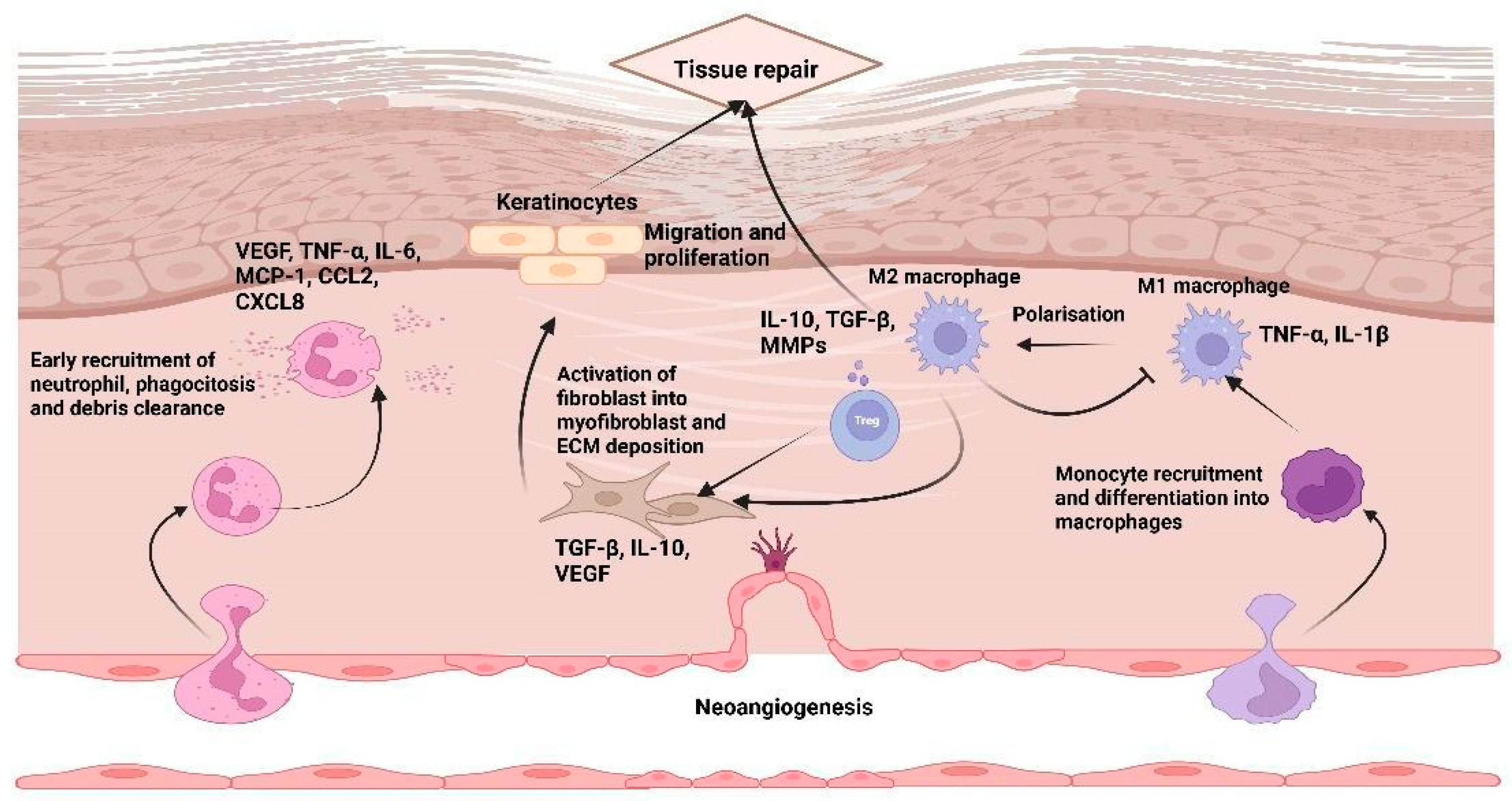 - Cioce, A.; Cavani, A.; Cattani, C.; Scopelliti, F. Role of the Skin Immune System in Wound Healing. Cells 2024, 13, 624. [Google Scholar] [CrossRef] [PubMed]