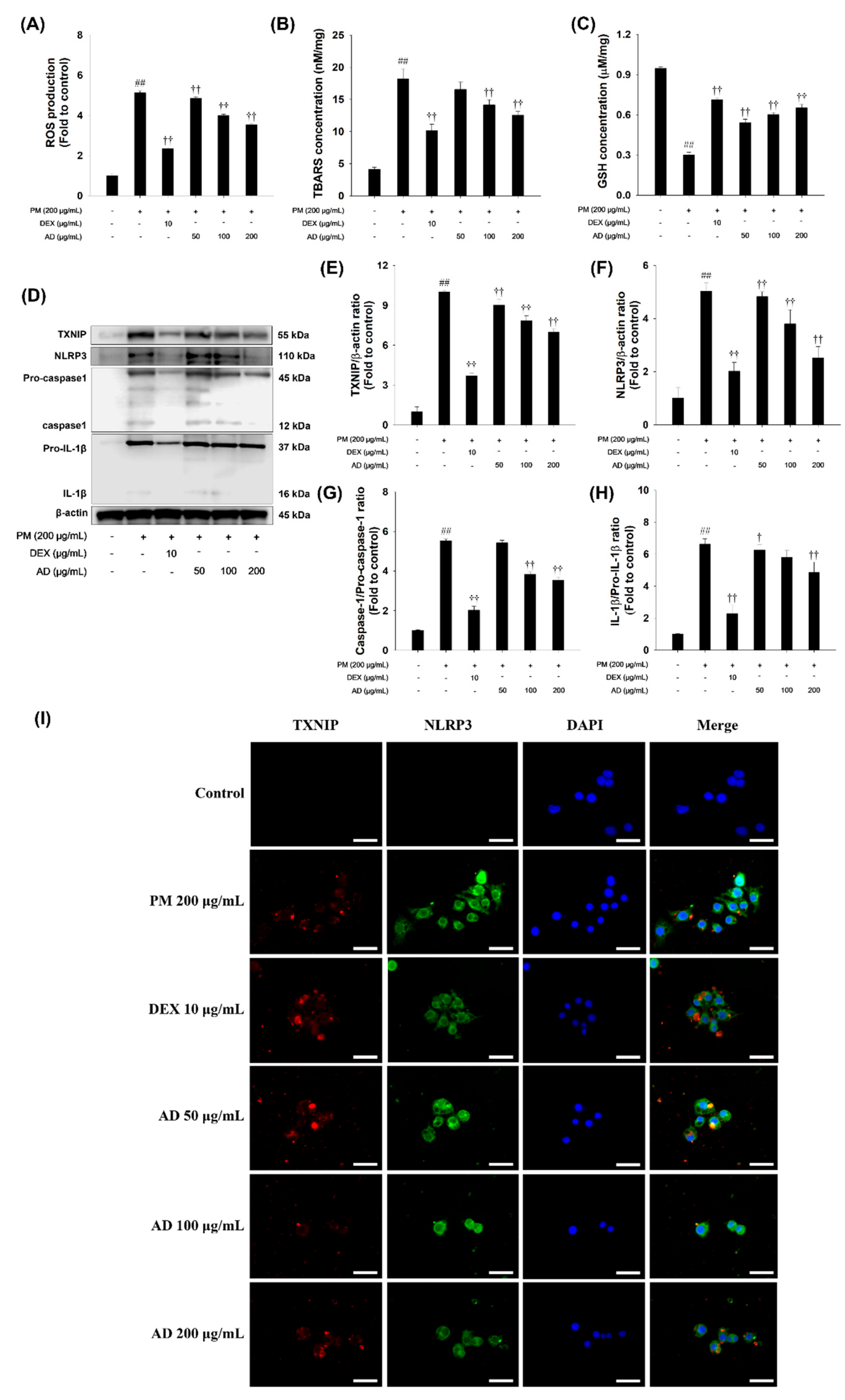 3.3. Effects of AD on the Oxidative Stress and TXNIP/NLRP3 Inflammasome Pathway in PM-Stimulated RAW264.7 Cells