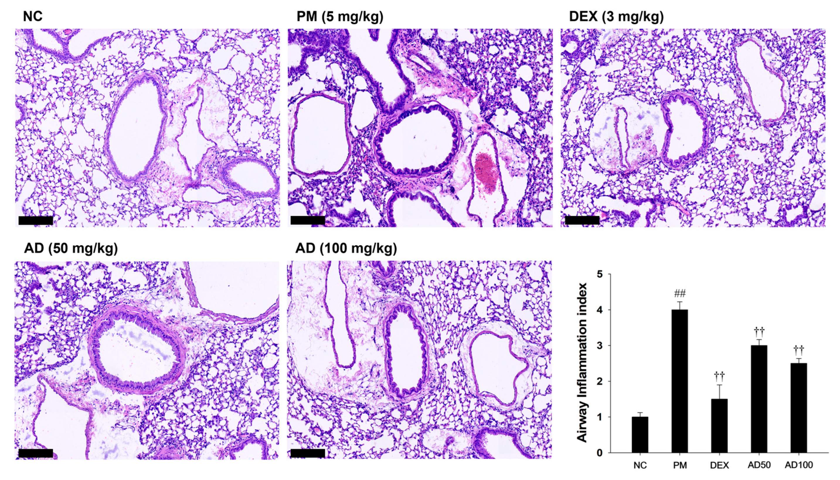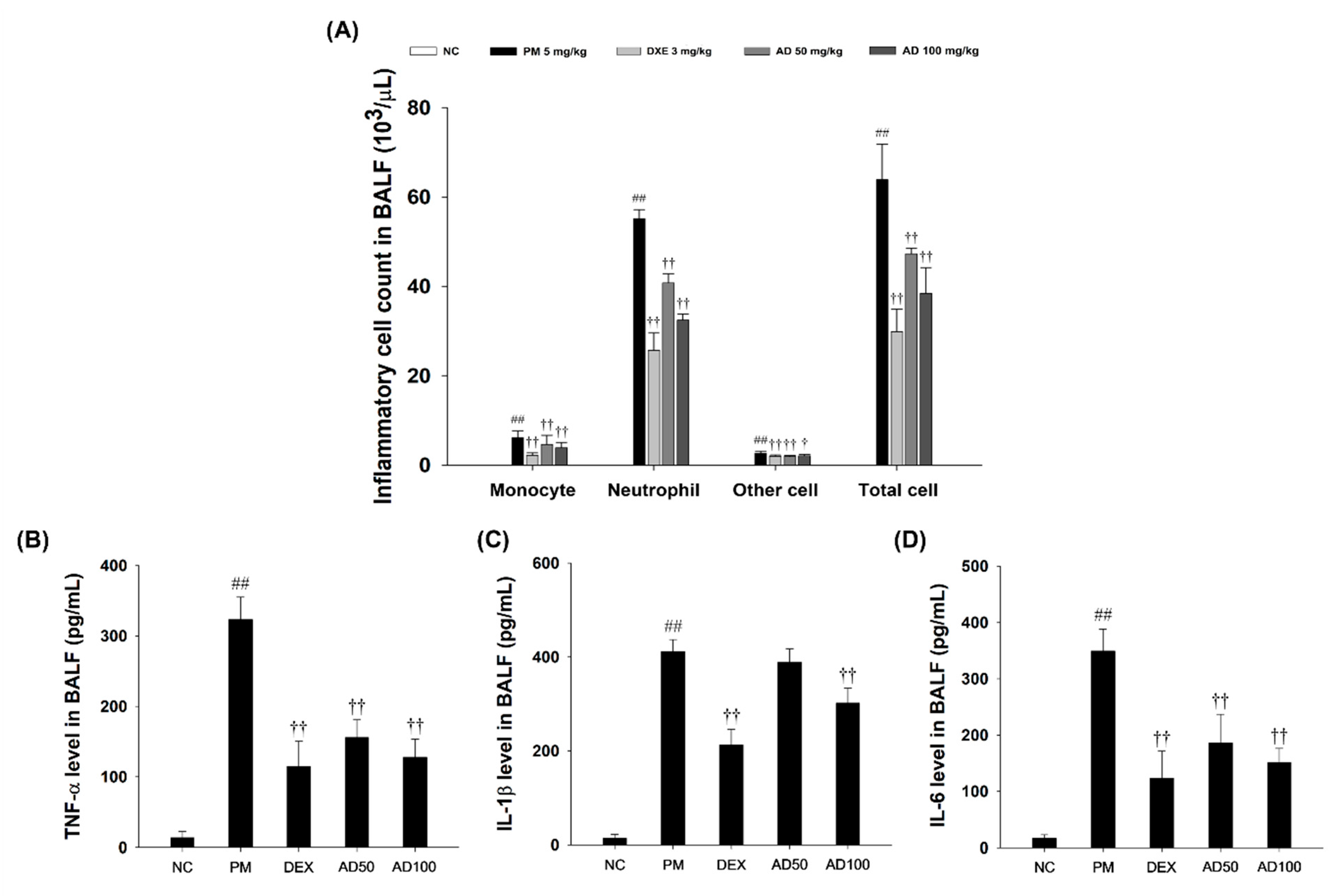 - AD significantly attenuated inflammatory responses in PM-stimulated in RAW264.7 cell and PM-induced lung inflammation mice. Treatment reduced inflammatory cell infiltration and pro-inflammatory cytokine levels in bronchoalveolar lavage fluid.
