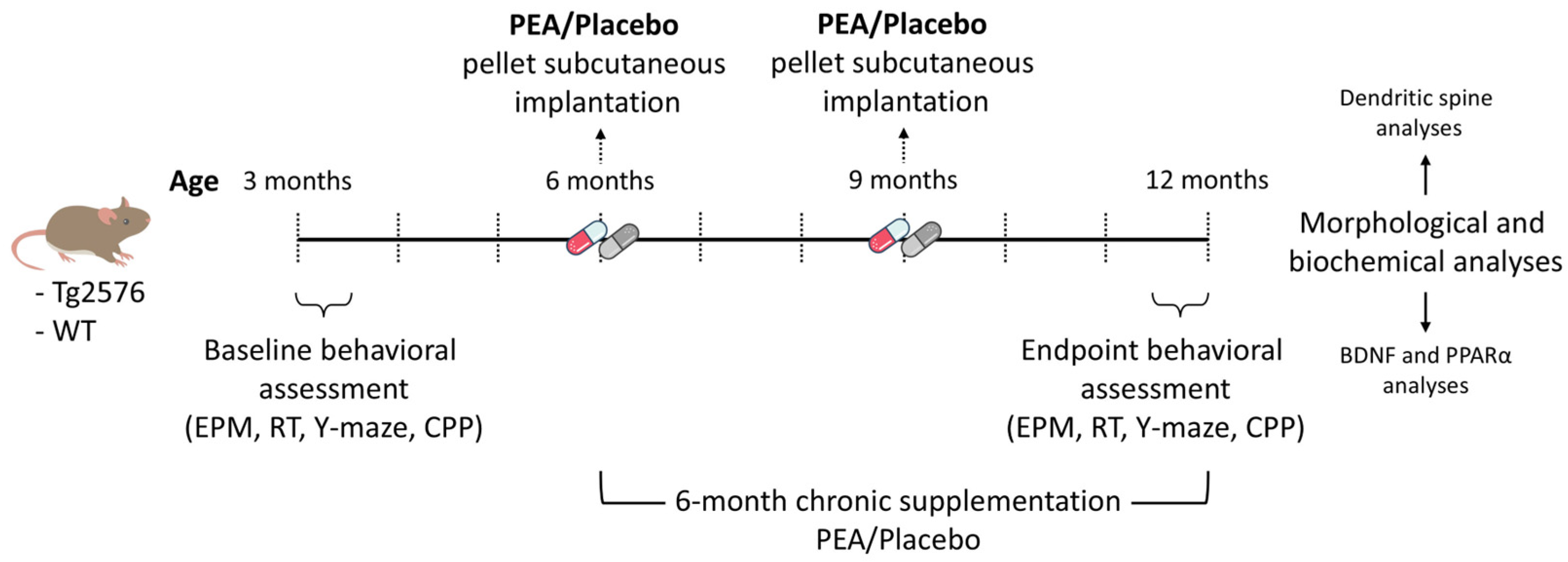 - Tortolani, D.; Decandia, D.; Giacovazzo, G.; Scipioni, L.; Panuccio, A.; Ciaramellano, F.; Eugelio, F.; Fanti, F.; Latagliata, E.C.; La Barbera, L.; et al. Chronic Palmitoylethanolamide Administration via Slow-Release Subcutaneous Pellets Promotes Neuroprotection and Mitigates Neuroinflammation in the Tg2576 Mouse Model of Alzheimer’s Disease. Front. Cell. Neurosci. 2025, 19, 1571428. [Google Scholar] [CrossRef]