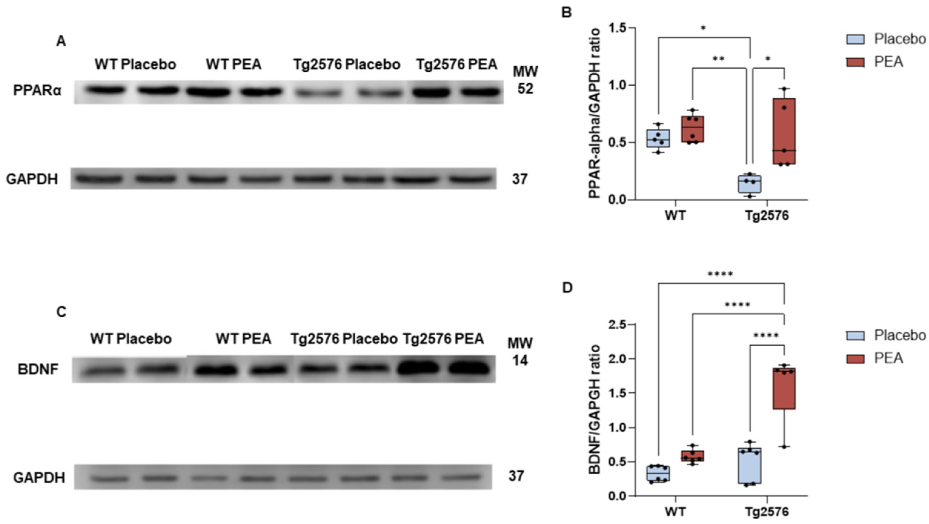 3.2. Chronic PEA Delivery Increased PPARα Expression in PFC from Tg2576 Mice