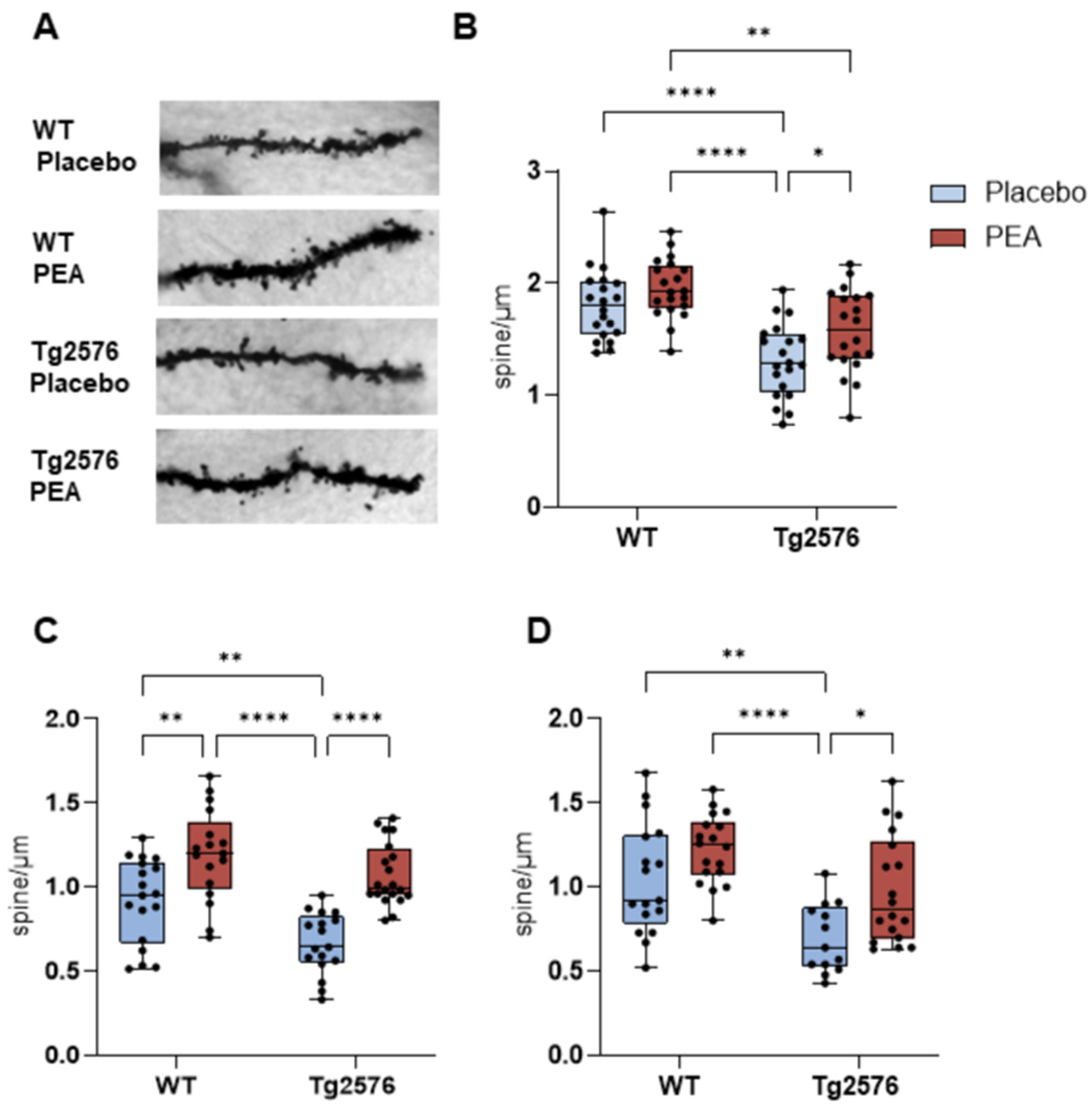 3.4. Chronic PEA Delivery Restored Dendritic Spine Loss in Tg2576 Mice