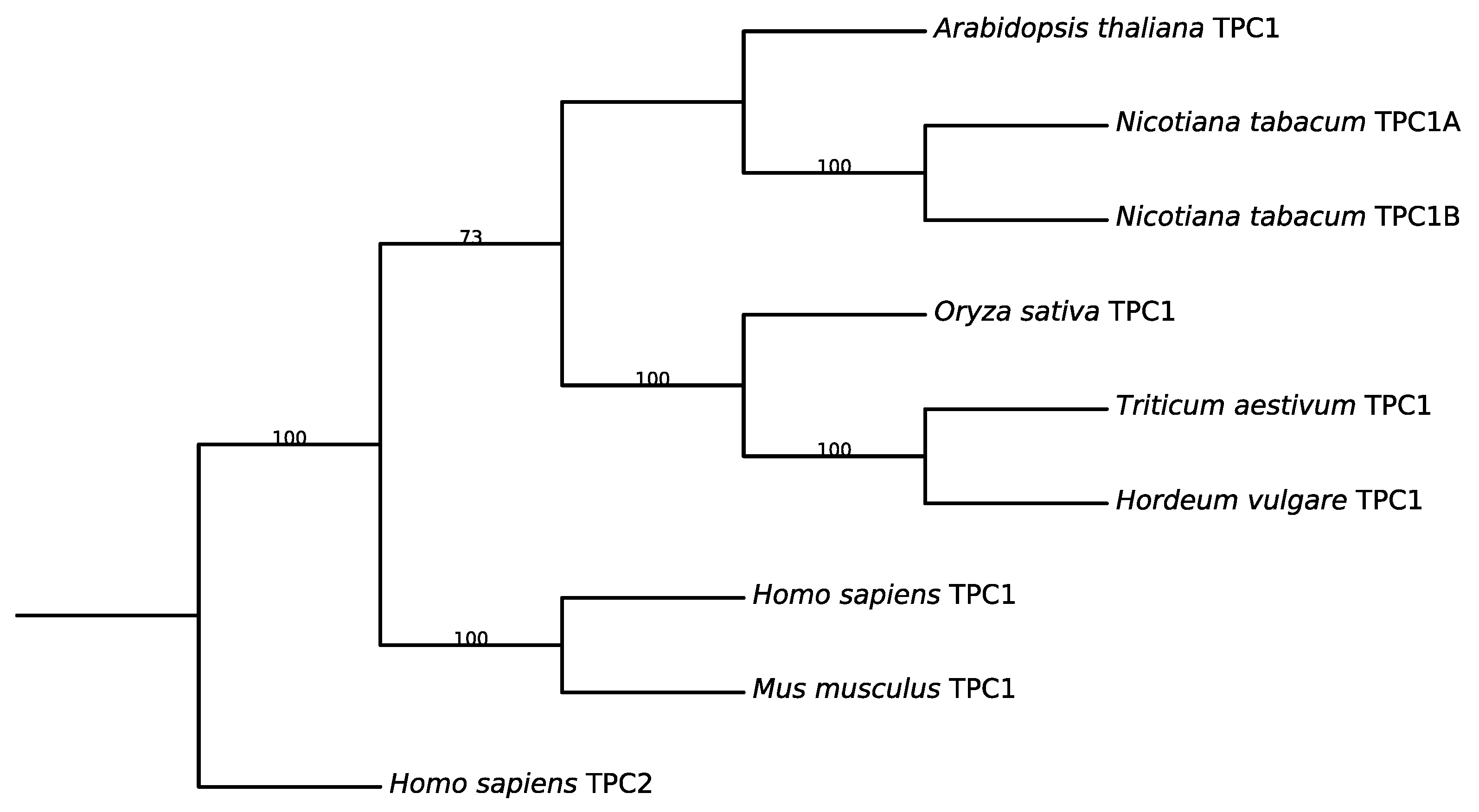 - Dadacz-Narloch, B.; Beyhl, D.; Larisch, C.; López-Sanjurjo, E.J.; Reski, R.; Kuchitsu, K.; Müller, T.D.; Becker, D.; Schönknecht, G.; Hedrich, R. A Novel Calcium Binding Site in the Slow Vacuolar Cation Channel TPC1 Senses Luminal Calcium Levels. Plant Cell 2011, 23, 2696–2707. [Google Scholar] [CrossRef]