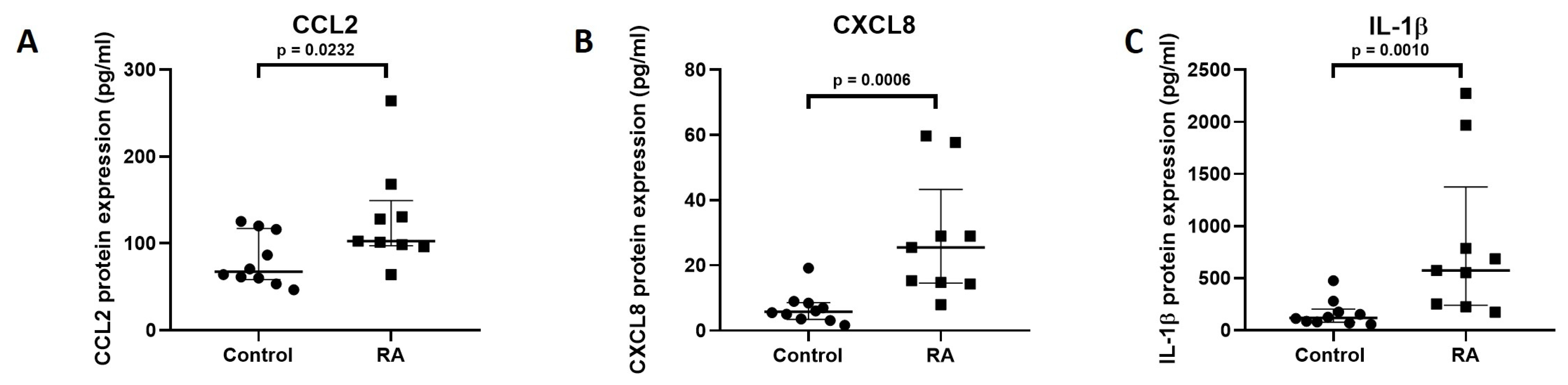 3.2. Increased Expression of Pro-Inflammatory Mediators in RA