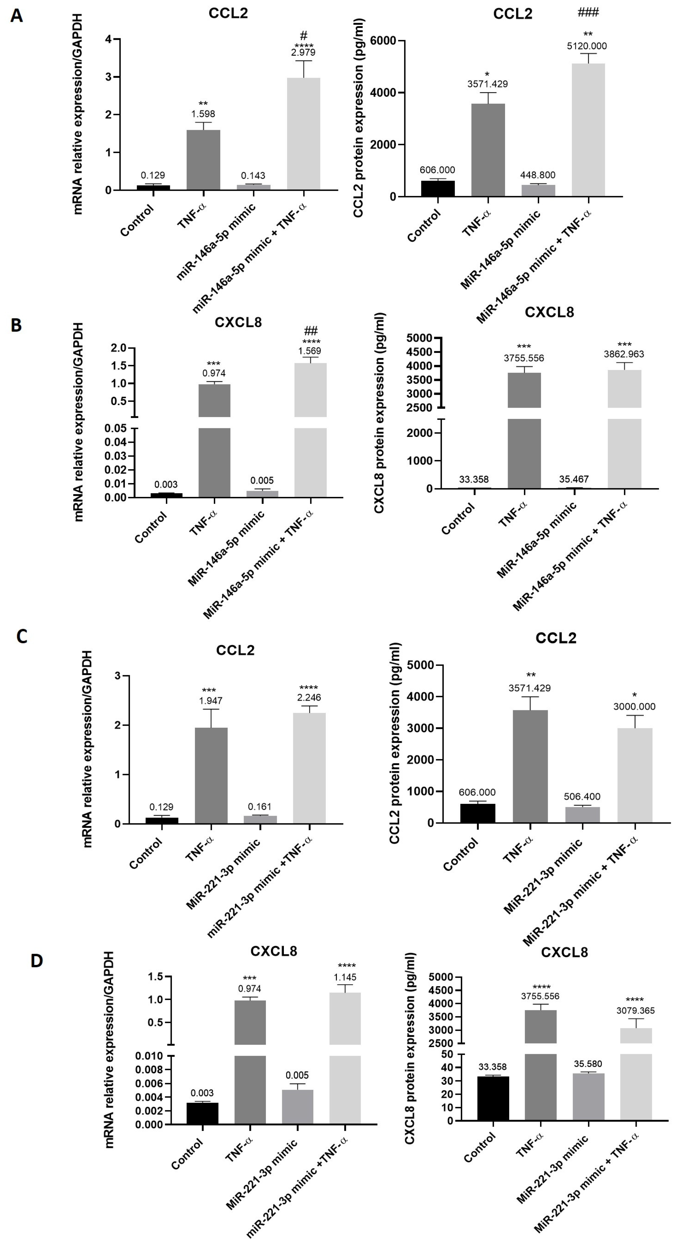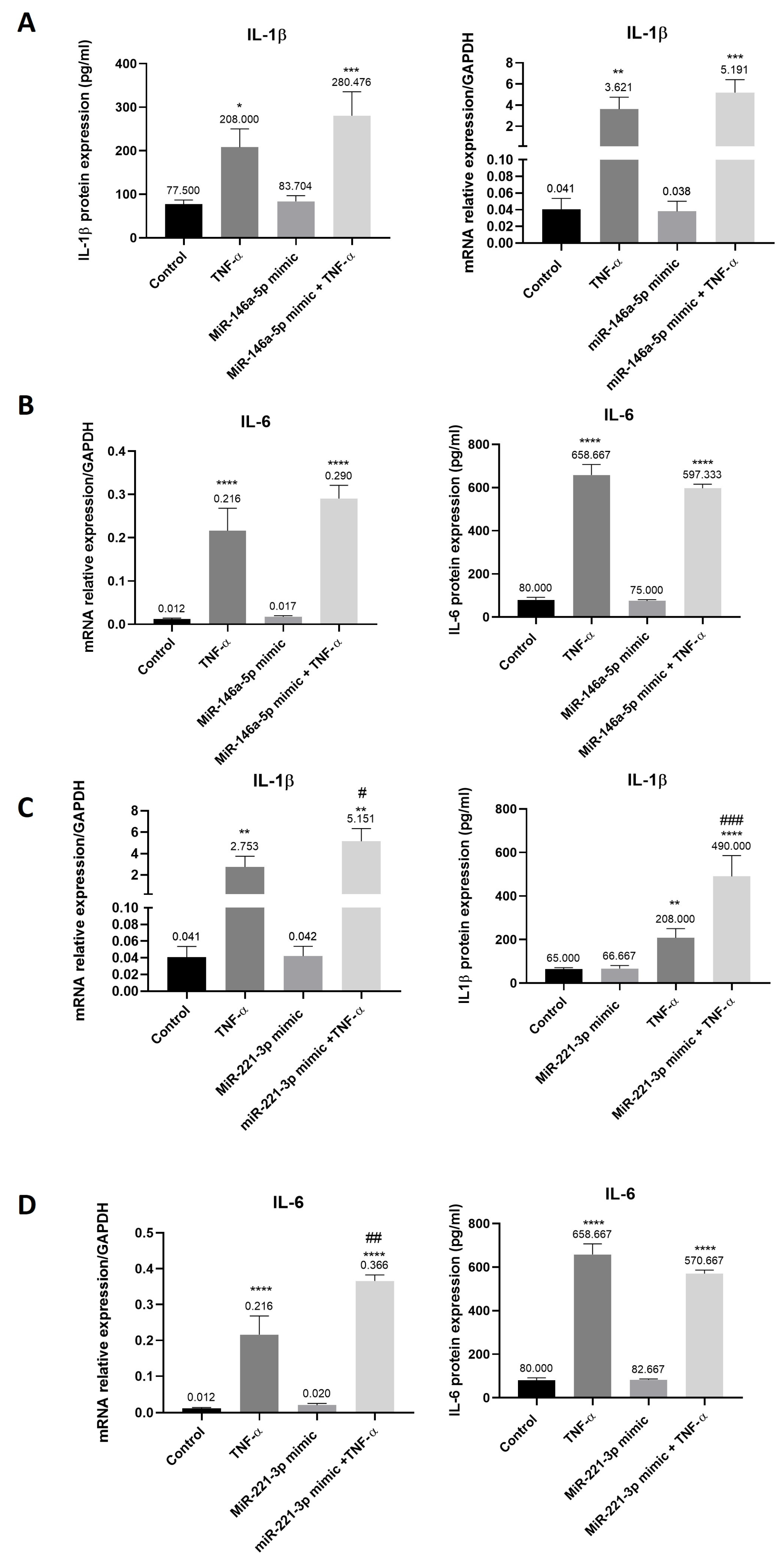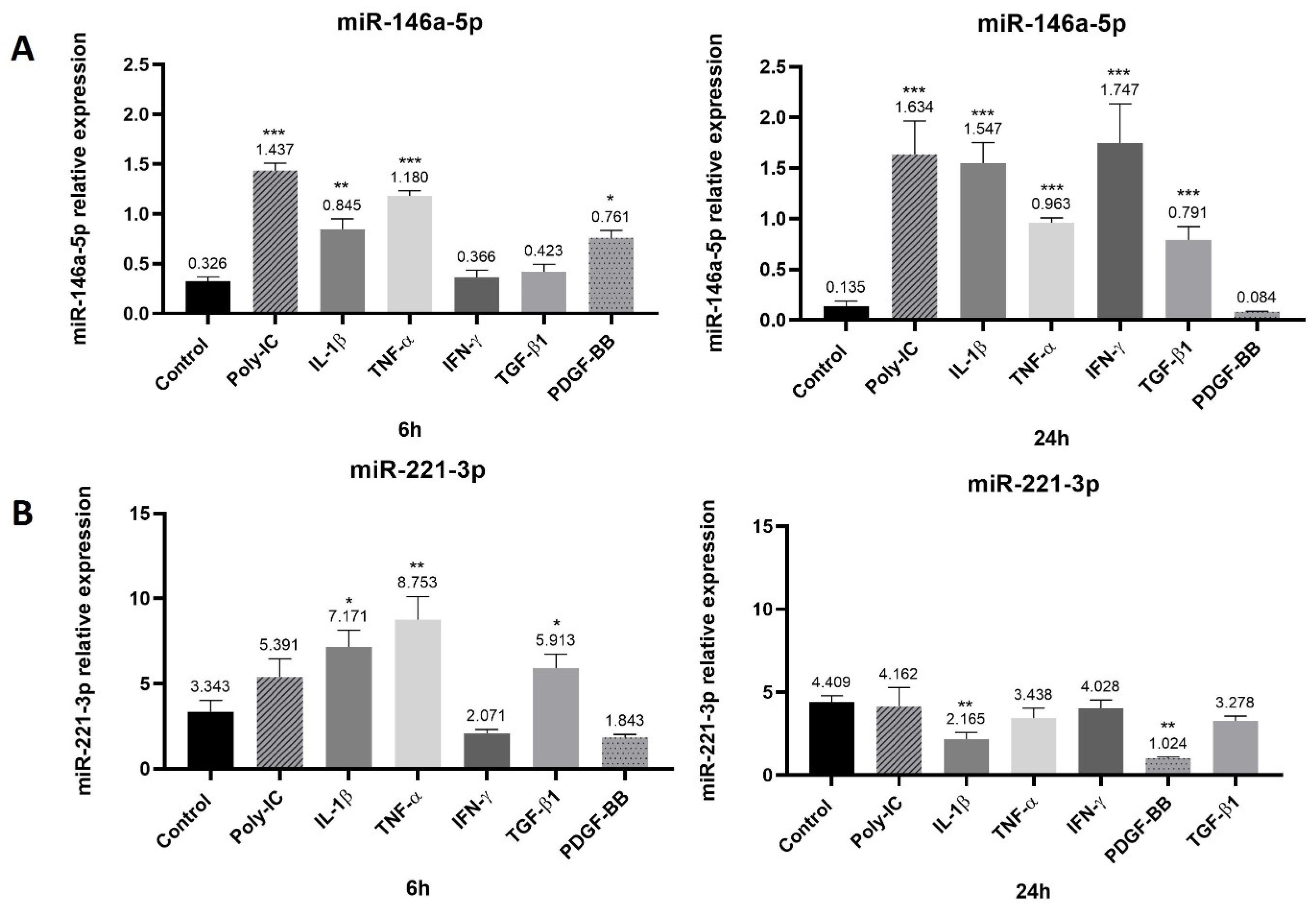 3.4. Modified Expression of miR-146a-5p and miR-221-3p in Response to Pro-Inflammatory Mediators