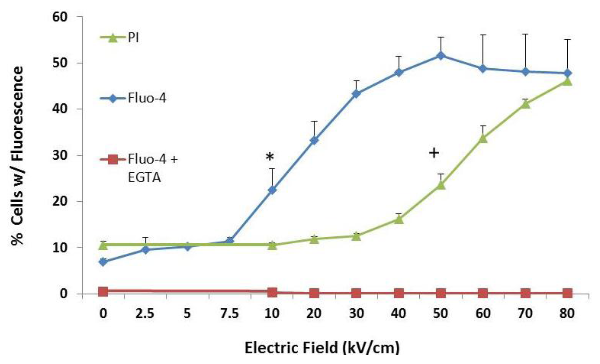 Nanosecond pulsed electric fields (NsPEFs) can induce nanopores larger than Ca2+ ions and smaller than PI molecules. N1-S1 HCC cells were treated with one 600 ns pulse with a rise-fall time of 15 ns at the electric fields indicated on the X-axis. Cells were loaded with Fluo-4 Direct as described in the Experimental Section. PI was added immediately after pulse treatments and cells were analyzed by flow cytometry 10 minutes after treatment. The Y-axis indicates the percentage of cells that exhibit fluorescence for either Fluo-4 or PI. When present, EGTA was 5 mM. Statistical significance is indicated at electric fields ≥ those electric fields with symbols; (;* p < 0.001 vs. PI control + p < 0.001 vs. Fluo-4 control (ANOVA with Tukey correction; n = 3). These data have been previously published in a different format [54].