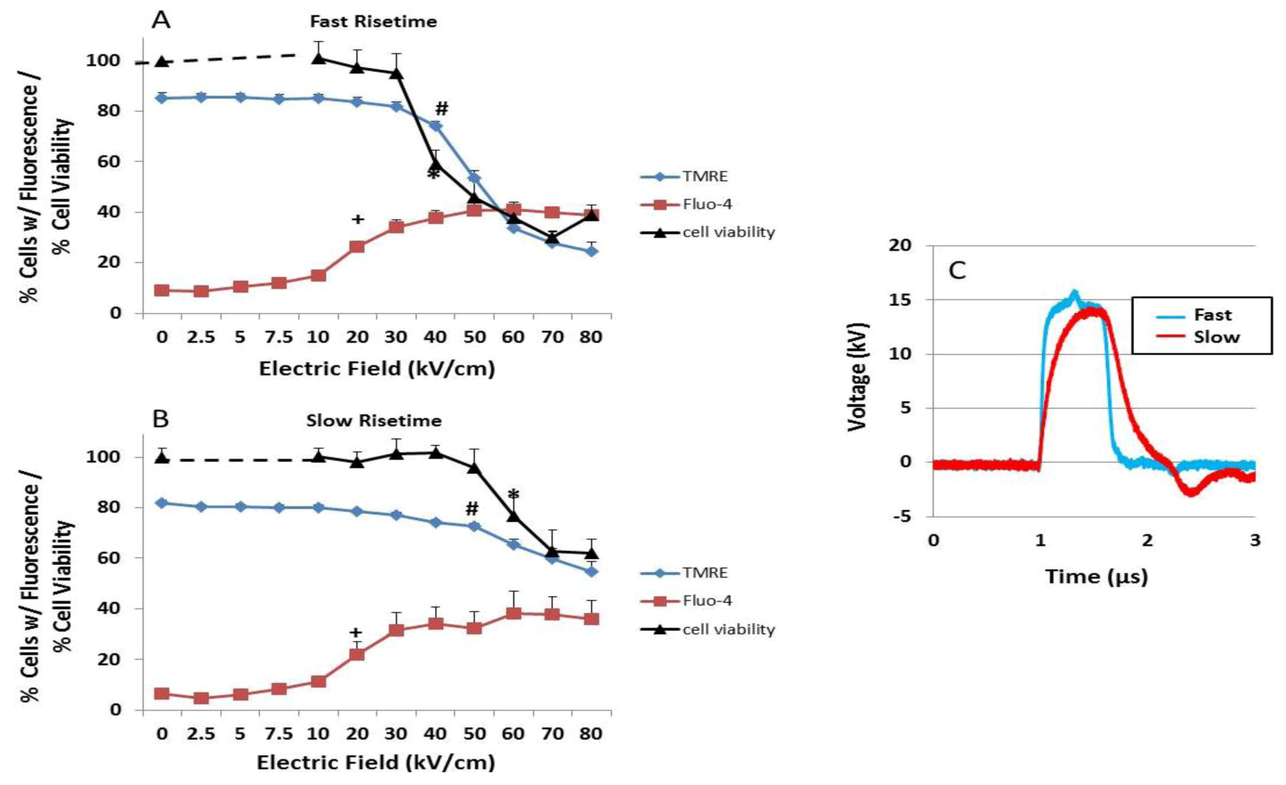 NsPEF fast rise-fall times target ΔΨm and cell viability—(A and B) N1-S1 HCC cells were loaded with Fluo-4 Direct to determine Ca2+ influx (red squares) and with TMRE to determine ΔΨm (blue diamonds) by flow cytometry as described in the Experimental Section. The Y-axis indicates the percentage of cells with fluorescence for either Fluo-4 or TMRE, which were determined 10 minutes after nsPEF treatment. In parallel experiments, the percentage of viable cells (black triangles) was determined 24 hours after treatment as described in the Experimental Section. (C) Cells were treated with one 600 ns pulse with a 15 ns fast rise-fall time waveform (blue line, panel A) or a 150 ns slow rise-fall time waveform (red line, panel B) at the indicated electric fields. For Panels A and B significant differences from control sham treatment are indicated for all electric fields ≥ the symbol for Fluo-4 (+p < 0.001, n = 3,); for TMRE (# p < 0.03, n = 3) and cell viability (* p < 0.001, n =3 ). (Correction: ANOVA with Tukey’s correction). These data have been previously published in a different format [54].