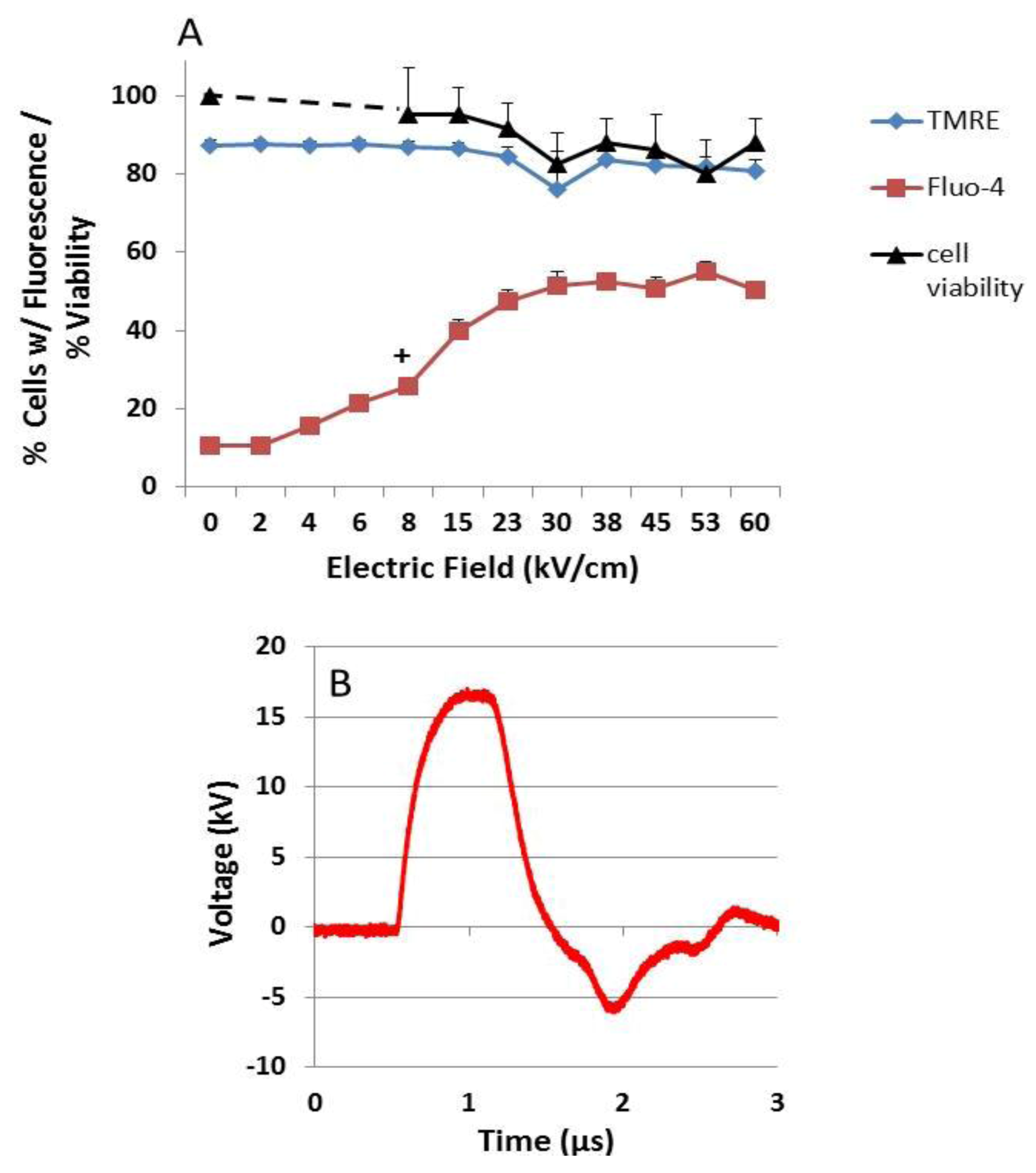 NsPEF effects on ΔΨm determine viability – (A) N1-S1 HCC cells were loaded with Fluo-4 Direct to determine Ca2+ influx (red squares) and with TMRE to determine ΔΨm (blue diamonds) as described in the Experimental Section. The Y-axis indicates the percentage of cells with fluorescence for either Fluo-4 or TMRE, which were determined by flow cytometry 10 minutes after nsPEF treatment. In parallel experiments, the percentage of viable cells (black triangles) was determined 24 hours after treatment as described in the Experimental Section. (B) Cells were treated with one 600 ns pulse with a 150 ns slow rise-fall time waveform (red line, panel B) with a mismatched load. Statistical differences vs. sham control (0 kV/cm): All n = 3; No significance with cell viability or with TMRE; for Fluo-4, all electric fields ≥ 8 kV/cm, *p < 0.03. ANOVA Tukey’s correction.