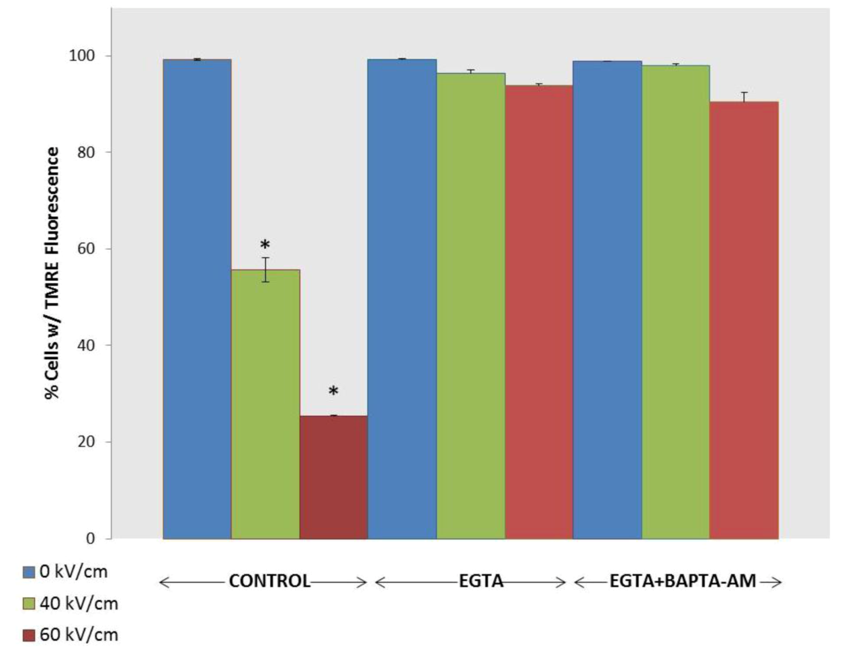 To determine whether nsPEF-induced dissipation of ΔΨm is Ca2+-dependent, Figure 4 shows experiments where the ΔΨm was determined using TMRE when N1-S1 HCC cells were preincubated in either EGTA or both EGTA and BAPTA-AM, which chelates extracellular and intracellular Ca2+, respectively. Cells were then sham treated or treated with single 600 ns pulses with a rise time of 15 ns at either 40 or 60 kV/cm. The ΔΨm was determined 1, 10 and 30 minutes after treatment. Experiments with BAPTA-AM alone are not shown because it cannot chelate all Ca2+ coming from both extracellular and intracellular sources; values at 40 and 60 kV/cm were not significantly different (p < 0.05) than those values in the absence of BAPTA-AM and/or EGTA. Results are shown in Figure 4 for the 10 minute time point. Both 40 kV/cm and 60 kV/cm induced a rapid, electric field-dependent decrease in ΔΨm in significant populations of cells. The ΔΨm continued to decrease by another 10–20 % of cells 30 minutes after treatment. In the presence of EGTA and EGTA & BAPTA-AM, there were no significant decreases in ΔΨm; the absence of Ca2+ extinguished the effects of nsPEFs on ΔΨm, indicating that nsPEF-induced decreases in ΔΨm are Ca2+-dependent. Similar results were shown for two different Jurkat clones, E6.1 and A3 (data not shown); although some Ca2+-independent loss of ΔΨm was observed in Jurkat cells, the loss was significantly Ca2+-dependent. These results have significant implications for determining mechanisms for nsPEF effects on mitochondria and for cell viability (Figure 3). Effects on ΔΨm were near immediate, which would be expected if nsPEFs caused nanoporation of inner mitochondria membranes; based on the supra-electroporation hypothesis [20,21]. However, nanoporation of inner mitochondria membranes is not expected to be Ca2+-dependent. Thus, nsPEFs appear to have effects distinct from nanopore formation. A possible explanation for these results is that nsPEF-induced dissipation of ΔΨm is due to activation of the mPTP complex, a complex protein structure spanning the inner and outer mitochondria membranes, or the membrane in which it is imbedded. Additional studies are needed to fully address this issue.