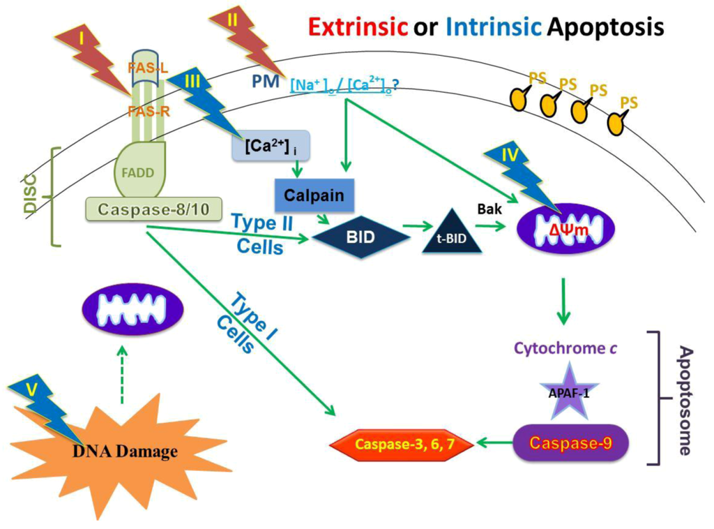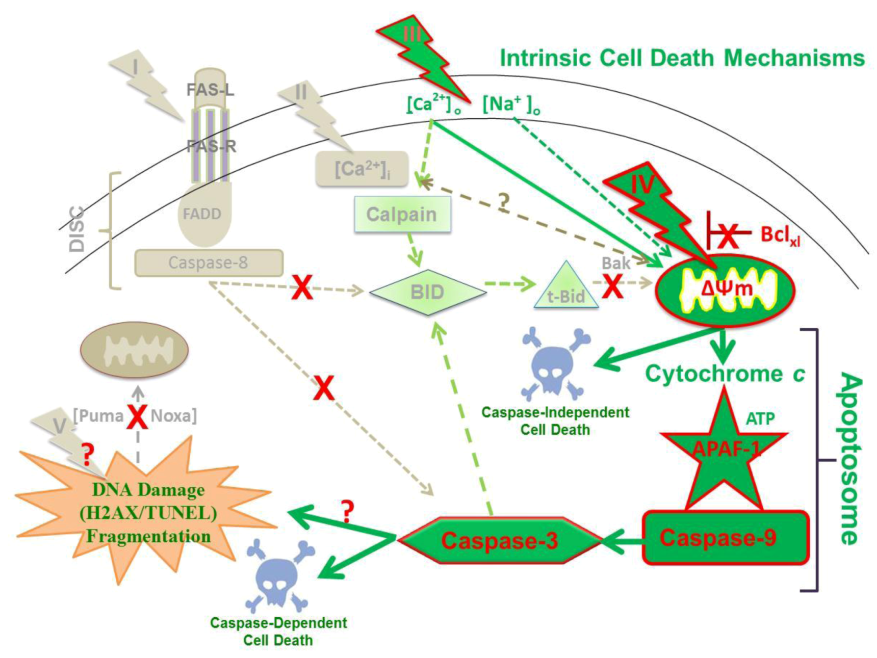 More directed towards studies that are reported here, a series of in vitro studies with HCT116 human colon carcinoma [25], B16f10 mouse melanoma [26] and mouse E4 squamous carcinoma cells [27] demonstrated nsPEFs induce apoptosis, which is often evaded in cancer cells [1,2]. In addition, nsPEFs induced apoptosis equally in HCT116p53(+/+) and HCT116p53(-/-) cells, suggesting that cell death could occur without p53-mediated responses to DNA damage [25]. However, in studies with E4 squamous carcinoma cells [27] and B16f10 cells [26], which did and did not release cytochrome c, respectively, elements of extrinsic and intrinsic apoptosis pathways were expected as well as other cell death mechanisms. To systematically investigate specific nsPEF targets and to determine cell death mechanisms, a study was carried out using human Jurkat clones that exhibited deficiencies in apoptosis-related proteins [28]. Although it was previously demonstrated that nsPEF-induced Jurkat cell death was coincident with cytochrome c release and caspase activation [22], it was not determined which initiator caspases were activated, whether a type II cell extrinsic and/or an intrinsic apoptosis mechanism was operative, whether cell death was actually dependent on caspase activation, or which cellular sites were targets for nsPEFs. Therefore, consideration was given to whether nsPEFs targeted one of more of five different cellular components for cell death induction (Figure 5). These components were (I) aggregation of the Fas receptor in plasma membranes; (II) permeabilization of plasma membranes, which included effects of sodium and Ca2+ influx on other cellular systems; (III) permeabilization of the ER, which would release Ca2+ and affect other systems, including calpain activation, stress responses and mitochondria function; (IV) permeabilization of the inner mitochondrial membrane or opening the mitochondria permeability transition pore (mPTP), which would result in dissipation of the ΔΨm; and/or (V) DNA damage, which could affect other systems. Suspected pathways included 1) activation of the death induced signaling complex (DISC) with caspase-8 directly to caspase-3 activation as observed in type I cells, 2) activation of DISC with caspase-8-mediated Bid cleavage and tBid activation of mitochondria responses as observed in type II cells, 3) activation of mitochondria responses for cytochrome c release, apoptosome formation with APAF-1, caspase-9 and then caspase-3 activation. This last pathway could be initiated directly at mitochondria or mitochondria response to other internal signals such as protein unfolding response and/or DNA/nucleus damage signals to mitochondria.