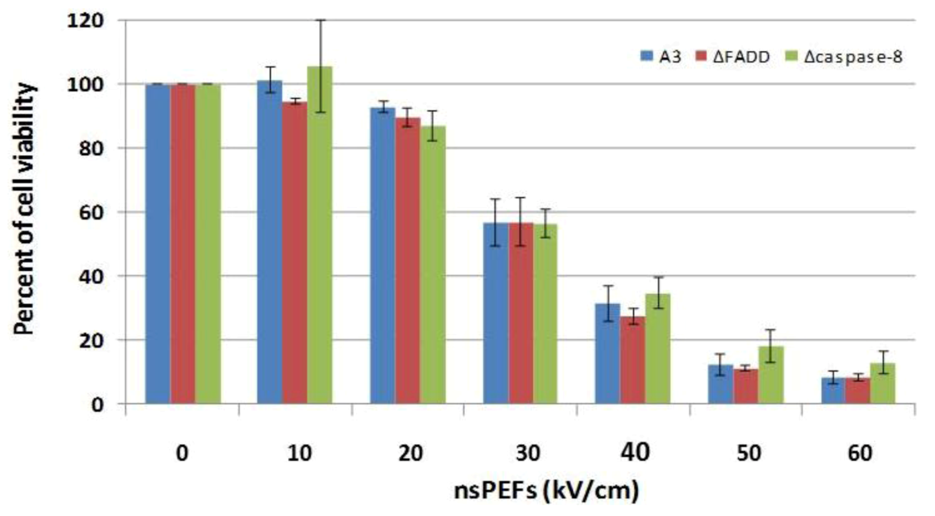 When cell viability was determined for each clone with increasing electric fields, it was determined that there were no differences in electric field-dependent decreases in cell viability; cell death in all clones exhibited identical electric field dependences (Figure 6). Electric field LD50 values were between 30 and 40 kV/cm and pulsing at 60 kV/cm resulted in about 10% survival in all three clones. Thus, cell death in Jurkat clones treated with nsPEFs appeared to be independent of DISC or other mechanisms using FADD or caspase-8. This is in contrast to survival of Fas-stimulated ΔFADD Jurkat cells [66], which we reproduced (data not shown). However, Jurkat cell death occurred when caspases were inhibited by z-VAD-fmk, which sensitizes cells to caspase-independent cell death pathway(s) with other apoptosis stimuli [66,67]. This has been characterized as programmed necrosis [68,69]. This indicates that like other apoptotic stimuli, nsPEFs can activate more than one cell death program, possibly programmed necrosis or necroptosis in the absence of active caspases.