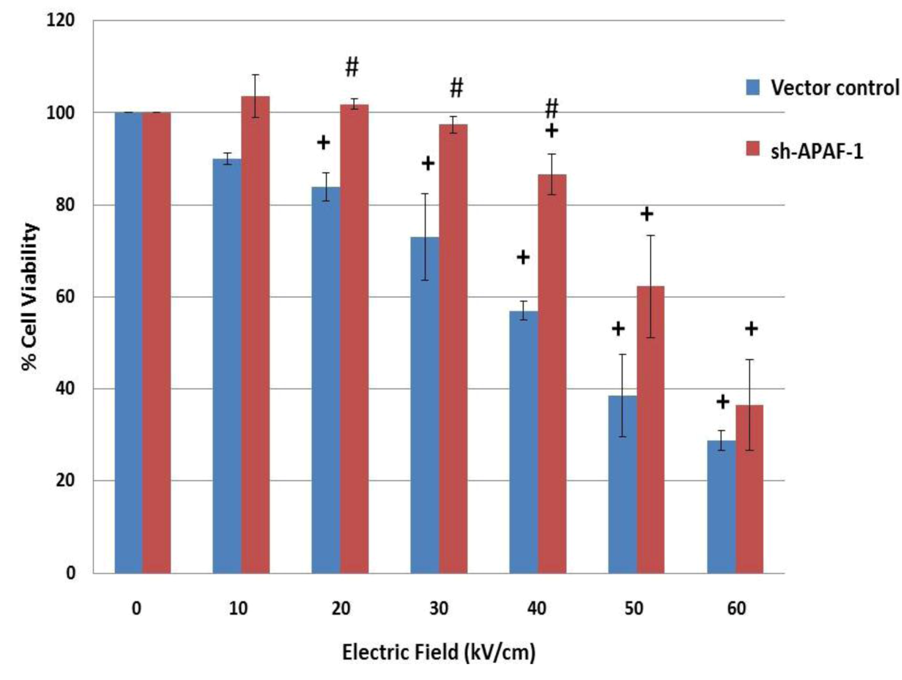 NsPEF-induced cell death is caspase-dependent at lower electric fields (20–40 kV/cm) and caspase-independent at higher electric fields (≥ 50 kV/cm) at in Jurkat cells: A Jurkat clone deficient in APAF-1 and its vector control were tested with ten 60 ns pulses with increasing electric fields. Cell viability was determined 24 hours later - as described in the Experimental Section. The same results were obtained with the MTS assay. For statistical significance: + p < 0.05 vs. sham control (0 kV/cm); # p< 0.05 vector control clone vs. sh-APAF-1 clone; (n = 3). These data have been previously published in a different format [28].