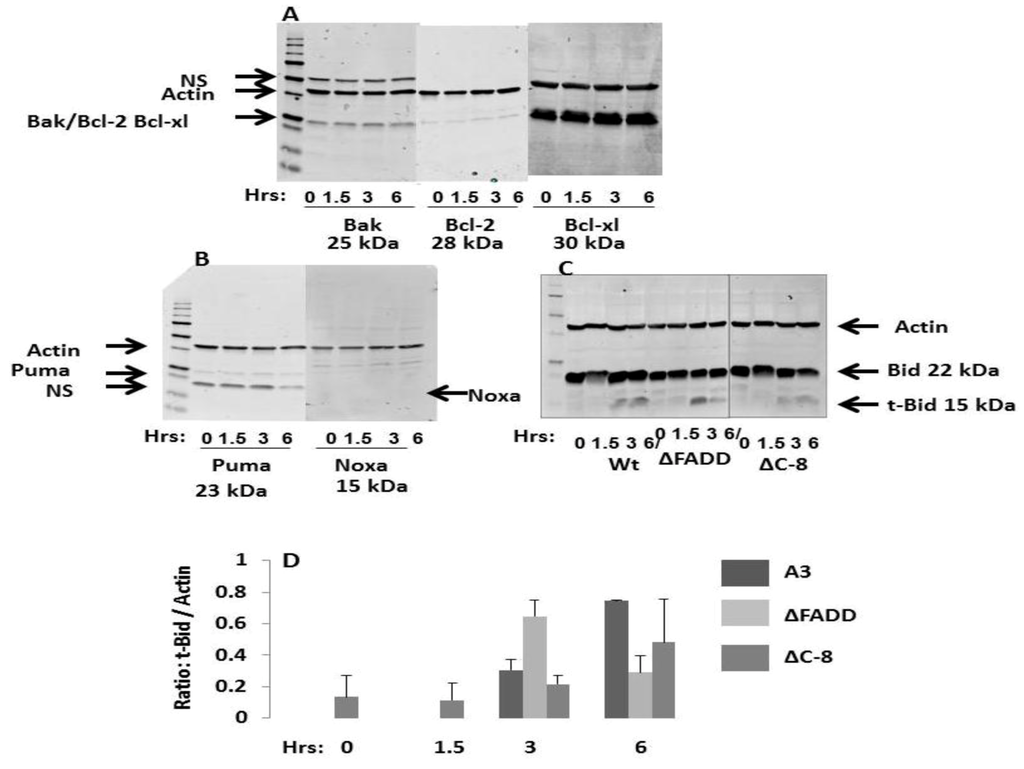 Some reports have indicated that nsPEFs increase or decrease the levels of endogenous Bcl-2 family proteins [25,27,70]. To determine whether nsPEFs affected pro- or anti-apoptotic proteins in human Jurkat clones, immunoblots were analyzed when cells were treated with ten 60 ns pulses at 60 kV/cm using antibodies against pro-apoptotic Bak (Bax is not expressed in Jurkat cells), anti-apoptotic Bcl-2 and Bcl-xl (Figure 8A) and anti-apoptotic BH3 only proteins Puma and Noxa (Figure 8B). In addition, since Bid is downstream of FADD and caspase-8, Wt, ΔFADD and ΔC-8 clones were analyzed for Bid cleavage (Figure 8C, D). The only protein level that changed in response to this lethal nsPEF condition was t-Bid. Within the first 6 hours after treatment, Bak levels did not change nor did Bcl-2 levels, which was expressed at relatively low levels. Bcl-xl, which was highly expressed, did not change nor did levels of Puma, which were expressed at low levels. Noxa levels were not detected. The results with Puma and Noxa, which are expressed in response to direct DNA damage [71], suggest that DNA damage may not be a major response to nsPEFs in Jurkat cells. Figure 8C shows a typical time course immunoblot for Bid and t-Bid and Figure 8D shows results from a series of immunoblot experiments. T-Bid was not present in sham-treated control cells, but increased in a time-dependent manner when cells were exposed to a lethal nsPEF condition. Interestingly, ΔFADD exhibited the greatest increase in Bid cleavage reaching a peak around 3 hours and decreasing by 6 hours, while the Wt continued to increase through the 6 hour time course. ΔC-8 clone exhibited the weakest activation of t-Bid, but was nevertheless present.