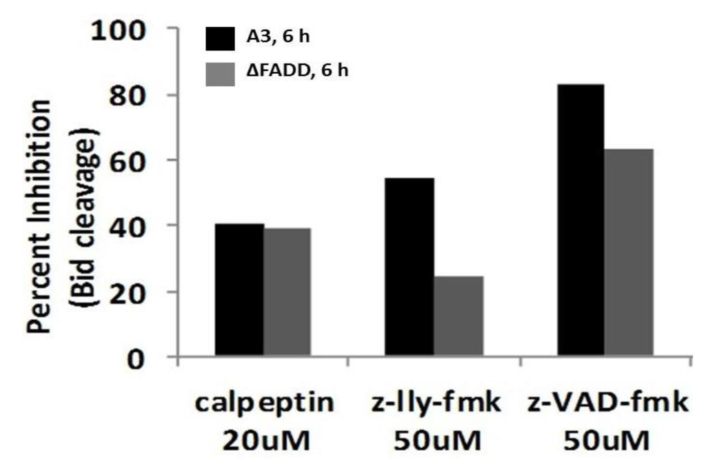 NsPEFs induce caspase- and calpain-dependent Bid cleavage in Jurkat cells. Jurkat A3 wildtype (dark bars) and a Jurkat clone deficient in FADD (ΔFADD) (light bars) were pre-incubated for 30 min in the presence of calpeptin (20 μM), z-LLY-fmk (50 μM), and z-VAD-fmk (50 μM) prior to nsPEF treatment with ten 60 ns pulses at 60 kV/cm or sham treated. Cell lysates were prepared 3 hours post pulse, separated by SDS-PAGE like experiments shown in Figure 8C and Bid and t-Bid were quantified using Odyssey infrared imager and normalized to total Bid levels in control. Results were plotted as the percent inhibition of Bid cleavage in the absence of inhibitors. Values represent a single experiment.