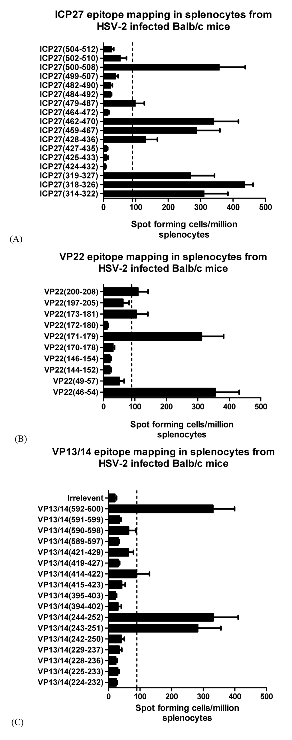 Identification of epitopes in ICP27, VP22 and VP13/14 from HSV-2 infected BALB/c mice. BALB/c mice were infected with 1 × 103 pfu of HSV-2 (strain 333) through intra-vaginal administration. After 14 days splenocytes were obtained and pulsed individually (5 × 105 cells) with 10 µg/mL of (A) ICP27, (B) VP22 and (C) VP13/14 derived peptides in an overnight IFN-γ ELISPpot assay. Counts are presented as spot forming cells per million splenocytes with standard error of means (SEM). Cut off values 2 SD over background were considered significant and spots reaching 90 SFU or above were defined as positive.