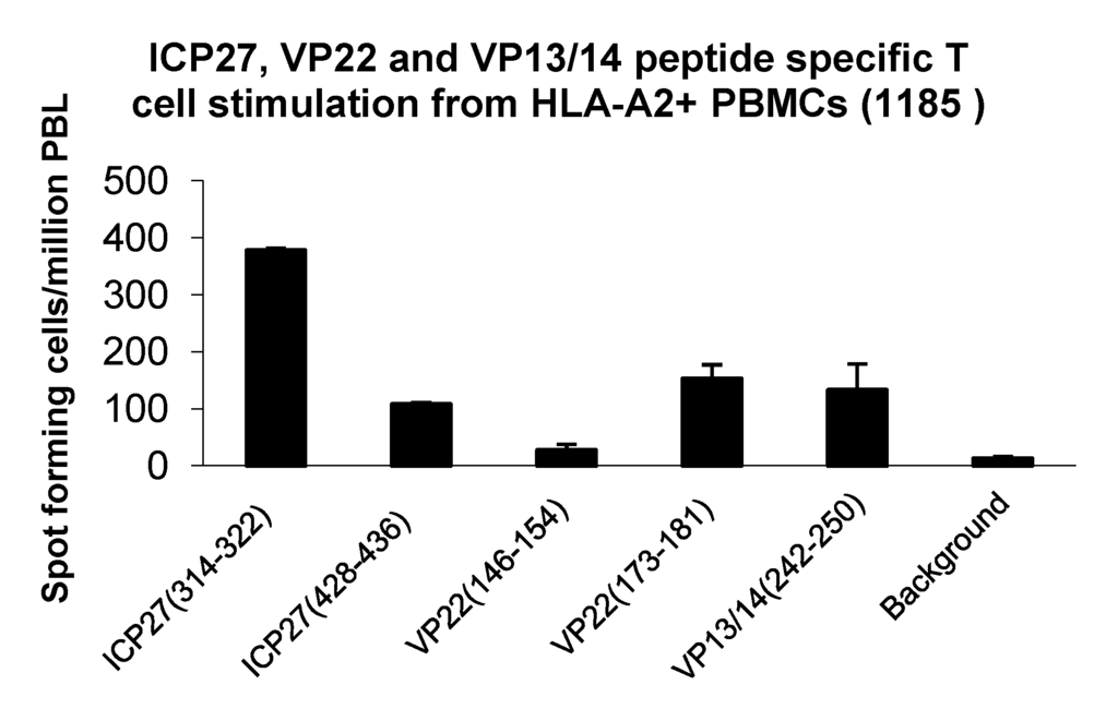 Generation and expansion of HSV-2 peptide specific T cells from an HLA-A*02+ donor (1185): PBL were derived from an HLA-A*02+ donor and stimulated with peptides from ICP27(314-322), ICP27(428-436), VP22(146-154), VP22(173-181) and VP13/14(242-150). After 4 stimulations cells were assessed for peptide specific responses by an overnight IFN-γ ELISpot assay. This figure represents the original count data from the ELISpot plate with standard deviations (SD).