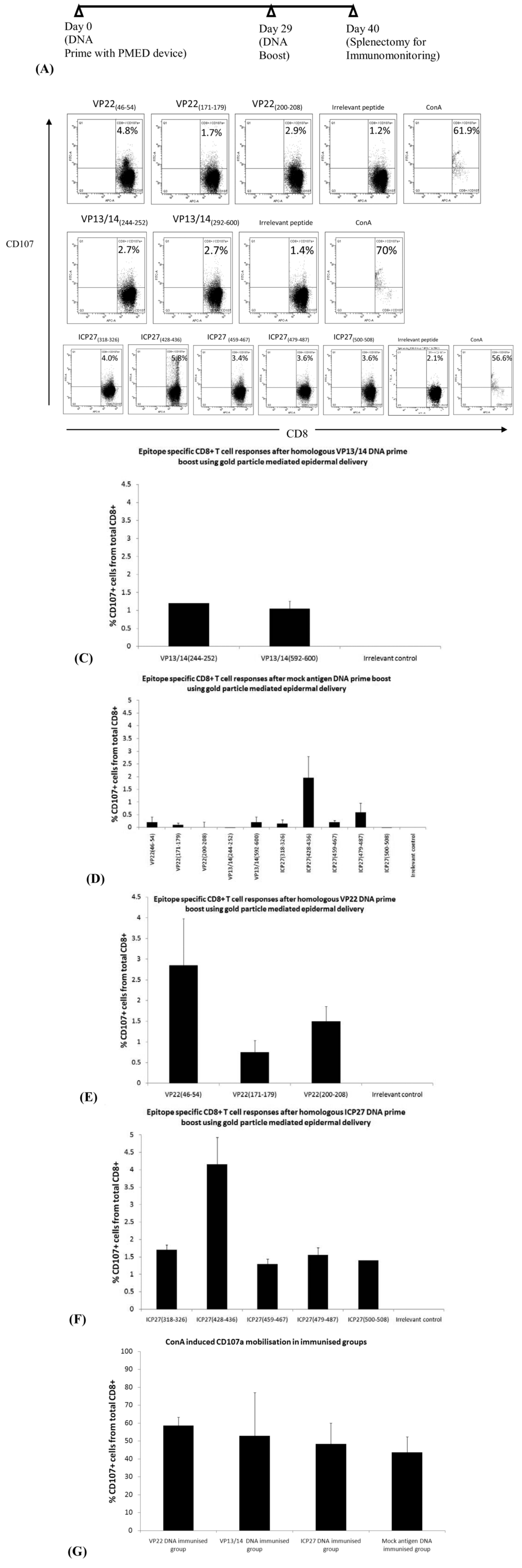 Mobilization of CD107a on peptide specific CD8+ T cells after DNA vaccine administration encoding the HSV-2 ICP27, VP22 and VP13/14 antigens. (A) BALB/c mice (n = 6) were immunized using the DNA prime-boost regimen using particle mediated epidermal delivery with full length monovalent vaccines (ICP27, VP22 and VP13/14). On day 40 splenocytes were harvested, pooled in their respective groups and pulsed with peptide for 4 hours in the presence of anti-CD107a-FITC antibody. (B) FACS plots are shown as CD107a+/CD8+ T cells as a percentage of total CD8+ T cells for VP22, VP13/14 and ICP27 peptide specific response. Irrelevant peptide control and ConA CD107a+/CD8+ responses are shown as negative and positive controls for CD107a degranulation. (C, D, E, F) Percentage of CD107a+/CD8+ T cell responses shown with irrelevant peptide responses subtracted from the total CD107a+/CD8+ T cell percentages for each of the HSV-2 DNA immunization group. (E) Graph showing CD107a+/CD8+ T cell responses in mice immunized with a mock antigen and pulsed with ICP27, VP22 and VP13/14 peptides. (G) Graph showing CD107a+, CD8+ T cell degranulation after ConA stimulation.