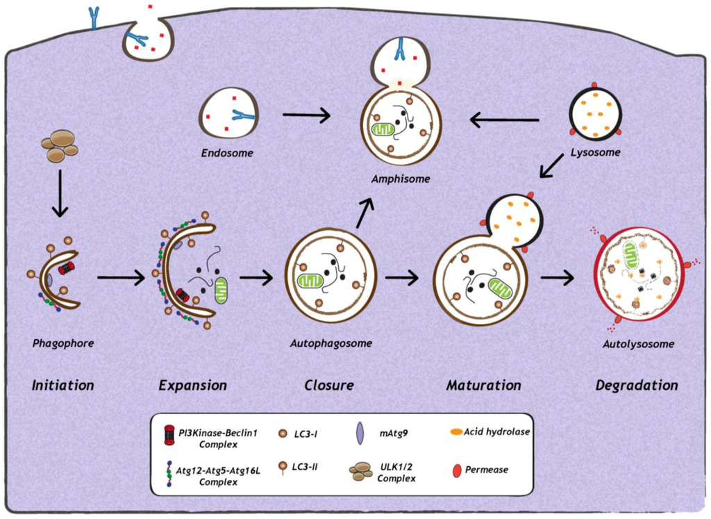 Schematic representation of autophagy. The first step in the initiation of mammalian autophagy is the formation of the phagophore, followed by subsequent steps, which include elongation and expansion of the phagophore, closure and completion of a double-membrane autophagosome (which engulfs a portion of the cytoplasm), autophagosome maturation via docking and fusion with endosomal compartments (to form a hybrid vesicular product known as an amphisome) and/or with a lysosome (to form the autolysosome). The inner autophagosomal membrane and cargo is degraded by acid hydrolases inside the autolysosome, and recycling of the resulting macromolecules is mediated via permeases. The molecular machinery regulating autophagy is also depicted. ULK1 and ULK2 complexes that are crucial for induction of autophagy, PI3Kinase-Beclin1 complexes, are required for autophagosome formation, the delivery of membranes to the forming autophagosome is mediated by mammalian Atg9 (mAtg9) and two conjugation systems: LC3-II and Atg12–Atg5–Atg16L complex, which are required during elongation and expansion of the phagophore.