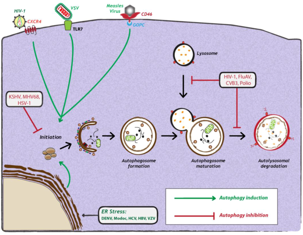 Viral manipulation of autophagy. Viruses can either induce (green arrows) or inhibit the autophagy pathway (red studded lines). Viral induction of autophagy can be achieved during viral entry via interaction with cell surface receptors, via interaction with stress sensors or during viral replication. Viruses also inhibit autophagy at early or late stages of the pathway, during initiation or maturation, respectively. For further details, see the legend for Figure 1. Abbreviations: HIV-1 (human immunodeficiency virus-1); CXCR4 (C-X-C chemokine receptor type 4); VSV (vesicular stomatitis virus); TLR7 (Toll-like receptor 7); CD46 (cluster of differentiation 46); GOPC (Golgi-associated PDZ and coiled-coil motif-containing protein); KSHV (Kaposi’s sarcoma herpesvirus); MHV68 (murine γ-herpesvirus 68); HSV-1 (herpes simplex virus-1); FluAV (influenza A virus); CVB3 (coxsackievirus B3); DENV (dengue virus); HCV (Hepatitis C virus); HBV (Hepatitis B virus); VZV (varicella-zoster virus) ER (endoplasmic reticulum).