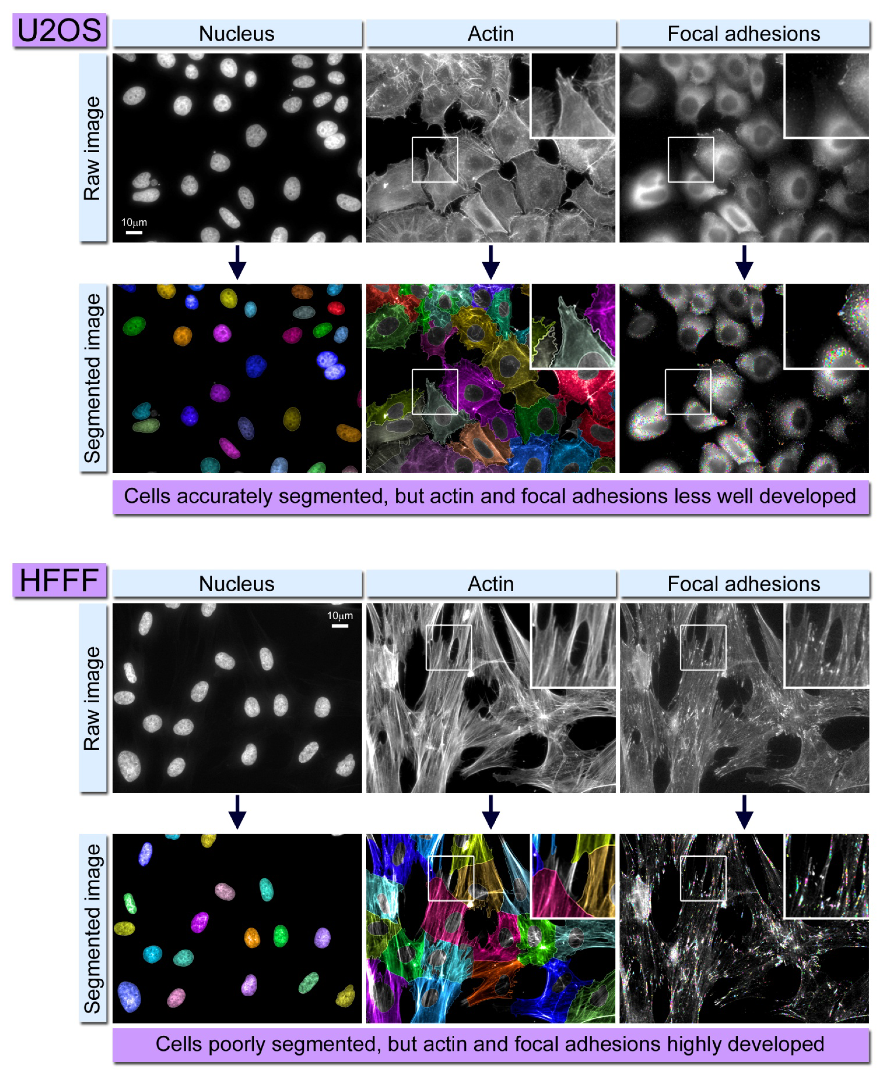 Example of problems that can arise during automated image analysis of cytoskeletal structures. Upper panel shows U2OS osteosarcoma cells fluorescently labeled for actin and focal adhesions. The cytoplasm of each individual cell (shown in the actin channels) is accurately segmented; however the focal adhesions are small and not prominent, therefore resulting in their poor detection (and therefore quantification) by the software. The lower panel shows HFFF (human fetal foreskin fibroblast) cells treated the same way as above. These particular cells have a well-developed cytoskeleton, and the focal adhesions are accurately identified. However as the peripheries of these cells grow over one another, their individual cytoplasms (and therefore cells) are often segmented incorrectly. In the processed (segmented) images the color coding is simply used to denote distinct objects (either nuclei, cytoplasms or individual focal adhesions).