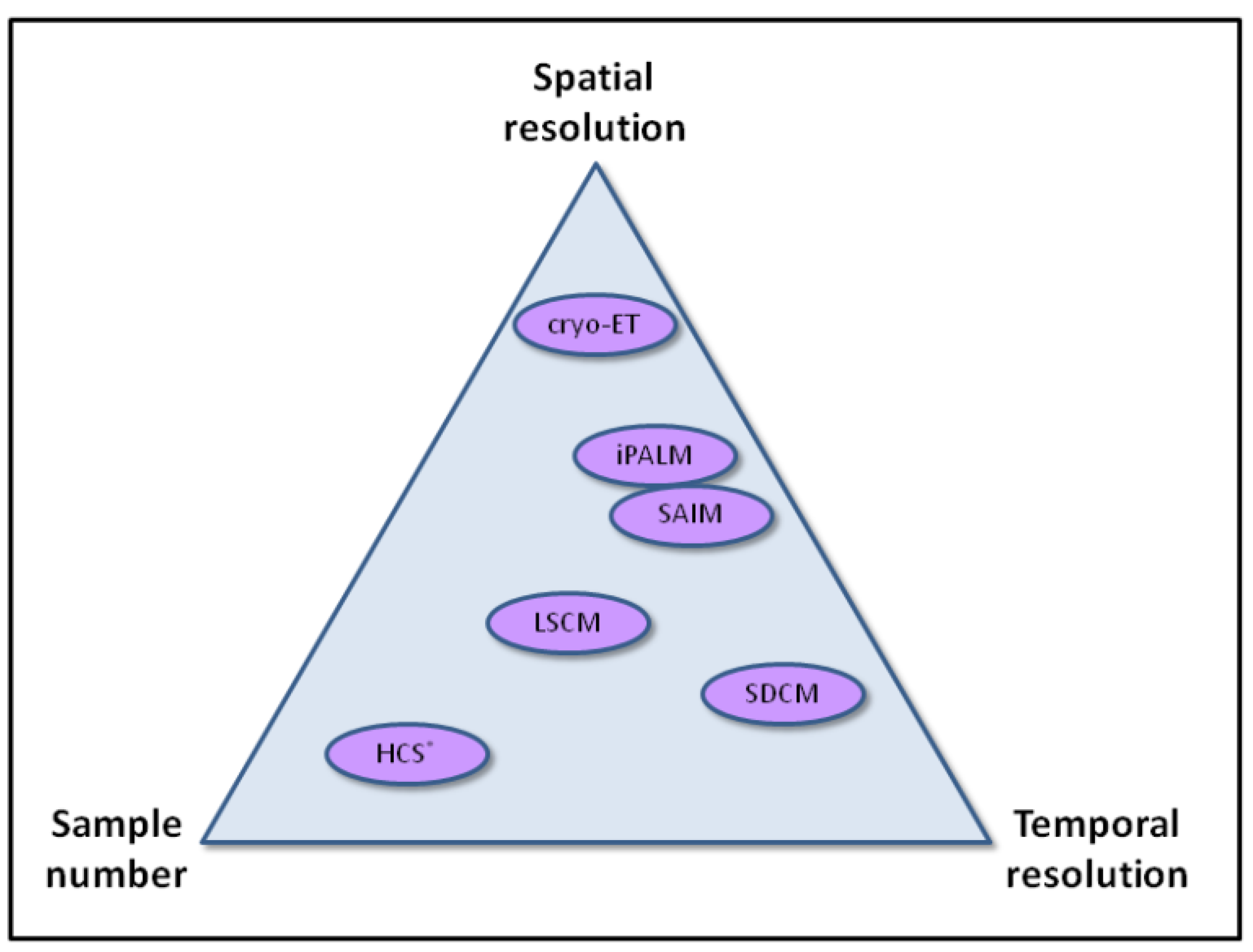 Schematic representation of how various imaging modalities compare in terms of spatial resolution, temporal resolution, and sample number.; note that the temporal resolution of HCS is largely determined by the number of samples analyzed in parallel.