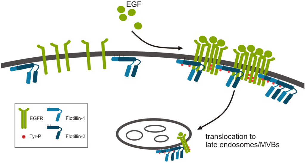 Upon EGF stimulation, flotillins undergo several changes (Figure 1). Flotillin oligomers increase in size upon EGF stimulation []. EGF stimulation further leads to phosphorylation of flotillin-2 at several tyrosine residues by Src kinases [] with whom flotillins have been shown to interact [,]. After growth factor stimulation, flotillins become endocytosed from the plasma membrane into late endosomes [,], and this EGF induced endocytosis requires the presence of Y160 in flotillin-1 [] and Y163 in flotillin-2 [,]. The Src family kinase Fyn directly phosphorylates flotillins at Y160 (flotillin-1) and Y163 (flotillin-2), respectively []. However, if this tyrosine phosphorylation itself is a prerequisite for endocytosis is not clear yet. We have shown that EGF induced endocytosis of flotillin-2 also takes place upon inhibition of Src family kinases, but it requires hetero-oligomerization of flotillin-1 and -2 [], while in another study inhibition of Src kinases prevented flotillin endocytosis []. Our data show that flotillins are not required for the endocytosis of EGFR itself []. However, a reduced EGFR internalization has been described in flotillin-2 deficient cells that overexpress very high amounts of EGFR [].