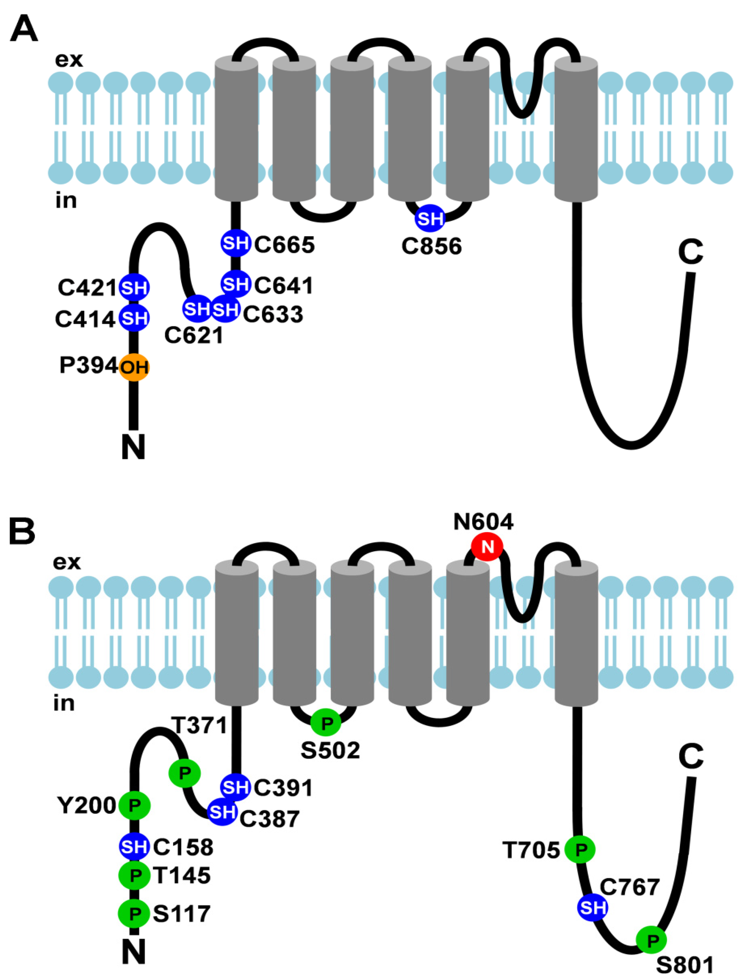 Post-translational modifications of TRPA1 and TRPV1. (A) Cartoon depicting TRPA1 and its post-translational modifications; (B) Cartoon depicting TRPV1 and its post-translational modifications. Amino acid residues that undergo post- translational modifications are depicted as circles. The N-linked glycosylation site is shown as a red circle with an N, cysteines that are modified are shown as blue circles with SH, hydroxylated proline is depicted as an orange circle with OH, and phosphorylation sites are represented by green circles with P. ex, extracellular; in, intracellular.