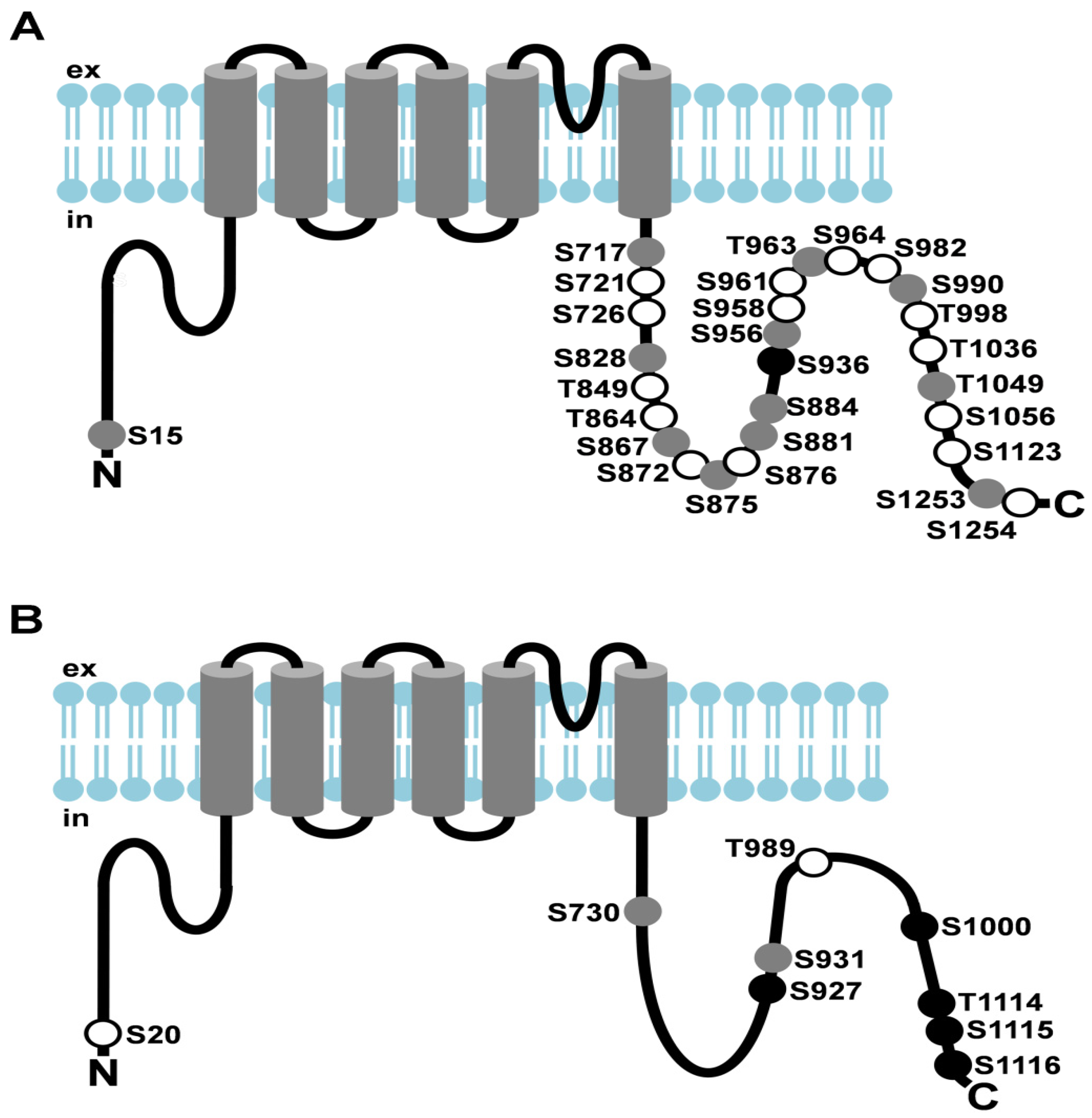 | phosphorylation by PKC | T646 S712 | 2nd intracellular loop | channel gating | [13,14] | ||