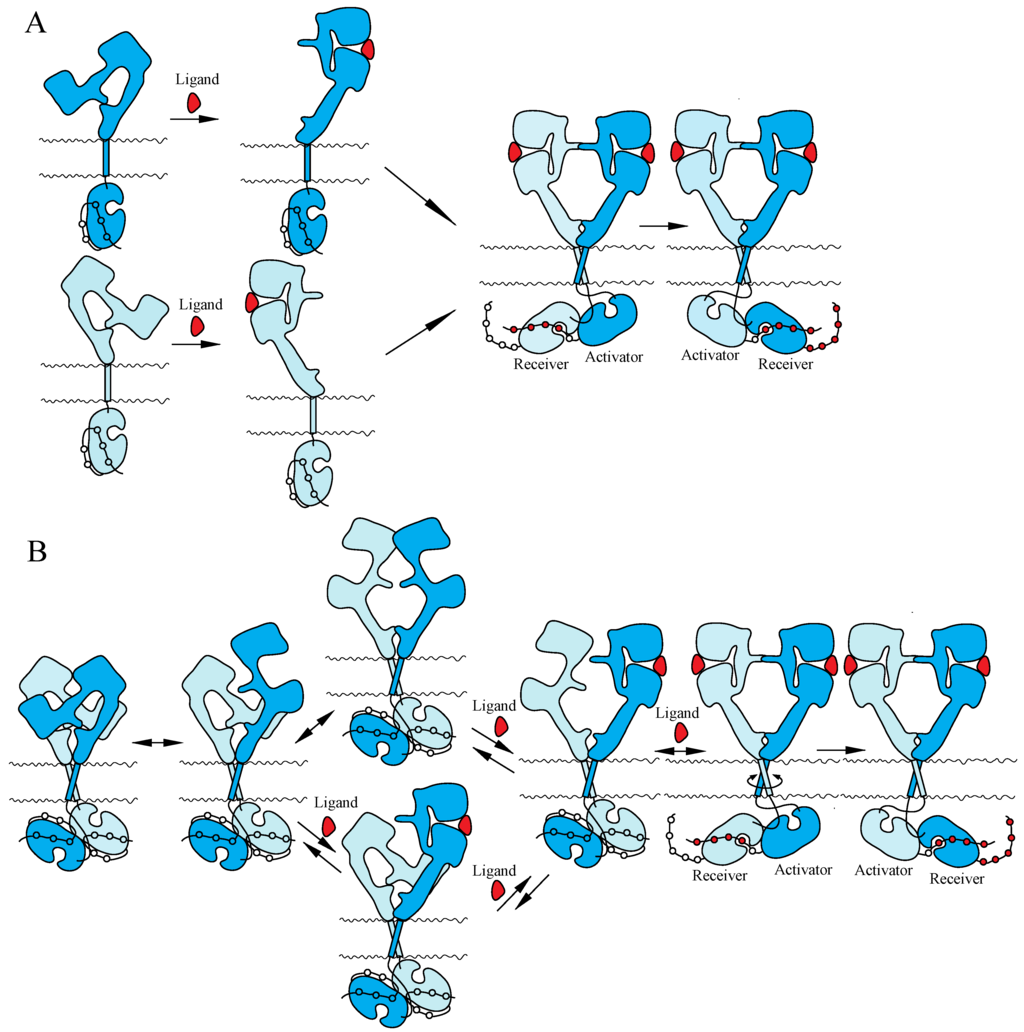 Two mutually exclusive ‘dimerization’ and ‘rotation/twist’ models for ligand-induced activation of the ErbB receptors have been proposed, based on the monomeric and dimeric structures of inactive ErbBs prior to ligand binding, respectively (Figure 3). Both of the models are consistent with the crystallographic structures with and without bound ligand described above. In the ‘dimerization’ model [,,], the receptor is proposed to exist as a monomer at the cell surface prior to ligand binding. Ligand binding to the extracellular I–III/L1–L2 domains of the tethered form releases the interaction between II/CR1 and IV/CR2 and exposes the ‘dimerization arm’ of the II/CR1 domain in its extended configuration. This exposed ‘dimerization arm’ interacts with the exposed ‘dimerization arm’ of the other receptor to form a dimer, in which two intracellular kinase domains assume the asymmetric active structure. In contrast, the ‘rotation/twist’ model [,] predicts that the receptor exists as a dimer at the cell surface, in which the extracellular regions have the tethered structure and the intracellular kinase domains have the symmetric, inactive dimeric structure. Upon ligand binding to untethered extracellular regions of the receptor dimer, two exposed ‘dimerization arms’ interact with each other to form extended configurations. This conformational change, from untethered to extended, induces the rotation/twist of TM segments [] that rearrange the inactive, symmetric kinase domain dimers to take the active, asymmetric conformation. In the asymmetric kinase dimers, the ‘activator/donor’ kinase activates the adjacent ‘receiver/acceptor’ kinase, as described above.