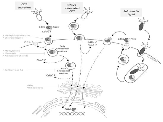 Cytolethal distending toxin (CDT) internalization and trafficking. Depending on the bacteria, CDT may be secreted freely, into outer membrane vesicles (OMVs) or, in the particular case of Salmonella typhi, into intracellular vesicles. In the case of a CDT extracellular secretion, CdtA and CdtC are involved in the toxin binding to the eukaryotic membrane. Once bound, CdtA remains associated with the membrane, while CdtC and CdtB are internalized, with CdtB being relocated to the nucleus by a retrograde transport pathway, via early and late endosomes. This has been demonstrated using inhibitors, such as methyl-β-cyclodextrin, methylamine, bafilomycin A1, BFA, etc. For OMV-secreted CDT, the toxin is internalized into the host cell through the OMV fusion with the eukaryotic membrane. CdtB is relocated to the nucleus by an undescribed pathway (dotted arrow), and the CdtA and CdtC outcome in the cytoplasm is still unknown. The typhoid toxin production requires S. typhi internalization into the host cell; thereafter, the toxin must be secreted to be active. The typhoid toxin interacts with the eukaryotic membrane and is endocytosed, and CdtB is relocated to the nucleus.