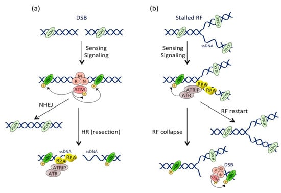 Activation and crosstalk between the ATM and ATR pathways. (a) Pathway activation at the double-stranded break (DSB). DSB formation induces the MRN-dependent ATM recruitment. ATM then phosphorylates numerous substrates, including itself and H2AX near the DSB site. DSB repair occurs through non-homologous end joining (NHEJ) or homologous recombination (HR) mechanisms (see Section 3.2 for details). During HR, resection of the DSB extremities produces ssDNA stretches that are coated by RPA, leading to ATRIP-dependent ATR recruitment and activation. (b) Pathway activation during replicative stress. Replication fork (RF) stalling induces ssDNA formation that is rapidly coated by RPA. This structure is recognized by ATRIP, which drives the recruitment and activation of ATR. Besides phosphorylating its other substrates, ATR locally phosphorylates H2AX. RF can restart in case of transient stress or collapse after prolonged stresses. RF collapse induces DSB formation and ATM pathway activation, leading to a second and more important wave of H2AX phosphorylation.