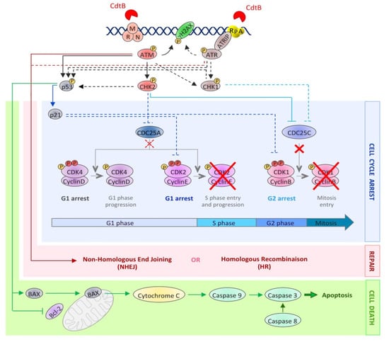 The activation of the DNA damage response upon CDT exposure. This picture depicts the DDR molecular events induced after CDT intoxication. The dotted lines represent well-studied events occurring during the DDR, but not yet demonstrated in the context of CDT exposure. CdtB-induced DNA lesions are detected by sensors, such as the MRN complex and RPA, resulting in the recruitment and the activation of the PI3K related kinases, ATM and ATR. ATM and ATR then phosphorylate hundreds of substrates, including H2AX, CHK1, CHK2 and p53 (black arrows). This signaling cascade results in the regulation of cell cycle modulators (blue lines), through the inhibition of CDC25C phosphatase by CHK2 and, possibly, CHK1. Phosphorylated CDC25C is unable to activate the cyclin B/CDK1 complex (red crosses), essential for mitotic entry. Moreover, the p53-dependent accumulation of p21 blocks cells in G1 by inhibiting the CDK2/cyclin E complex. At the same time, the DSB repair mechanisms (NHEJ and HR) are activated by ATM and ATR (red arrows). However, if the level of DNA lesions is too severe, the process of cell death is initiated (green arrows). Apoptotic cell death can be induced by an intrinsic pathway involving p53 activation, leading to an increase in the BAX level, the sequestration and inactivation of Bcl-2, the mitochondrial release of cytochrome C and caspase 9 activation. Apoptosis can also be induced through the activation of the extrinsic pathway, involving caspase 8 activation. In both cases, this leads to caspase 3 activation and apoptotic cell death.
