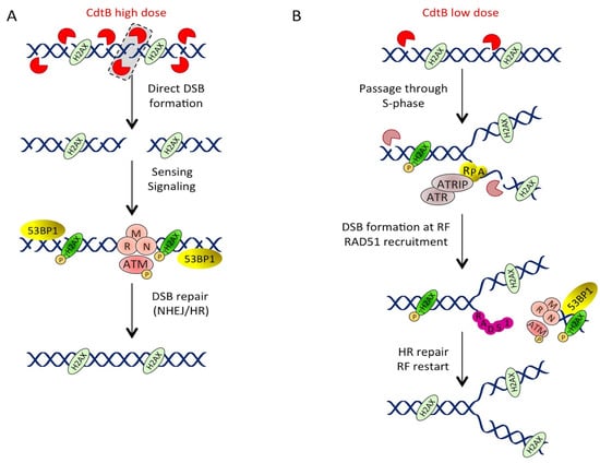 A model of CDT-mediated DSB formation and repair. (A) Direct DSB formation with high doses of CDT. CdtB induces a large number of nicks on the host cell DNA. When two closed nicks face each other on opposite strands (dashed rectangle), they directly create a DSB that is sensed by MRN and signaled by ATM, resulting in H2AX phosphorylation and 53BP1 recruitment. This lesion will be repaired by NHEJ or HR. (B) Low doses of CDT induce S-phase-associated DSB. At low doses, the number of nicks is not large enough to produce direct DSBs. However, if these nicks are left unrepaired or if CdtB induces nicks during the S-phase (hatched CdtB), these lesions will block RF progression, resulting in ssDNA accumulation. ssDNA is then coated by RPA, leading to ATR activation. Then, the RF collapses, resulting in DSB formation and ATM pathway activation. RAD51 is recruited in order to restart the RF through HR repair.