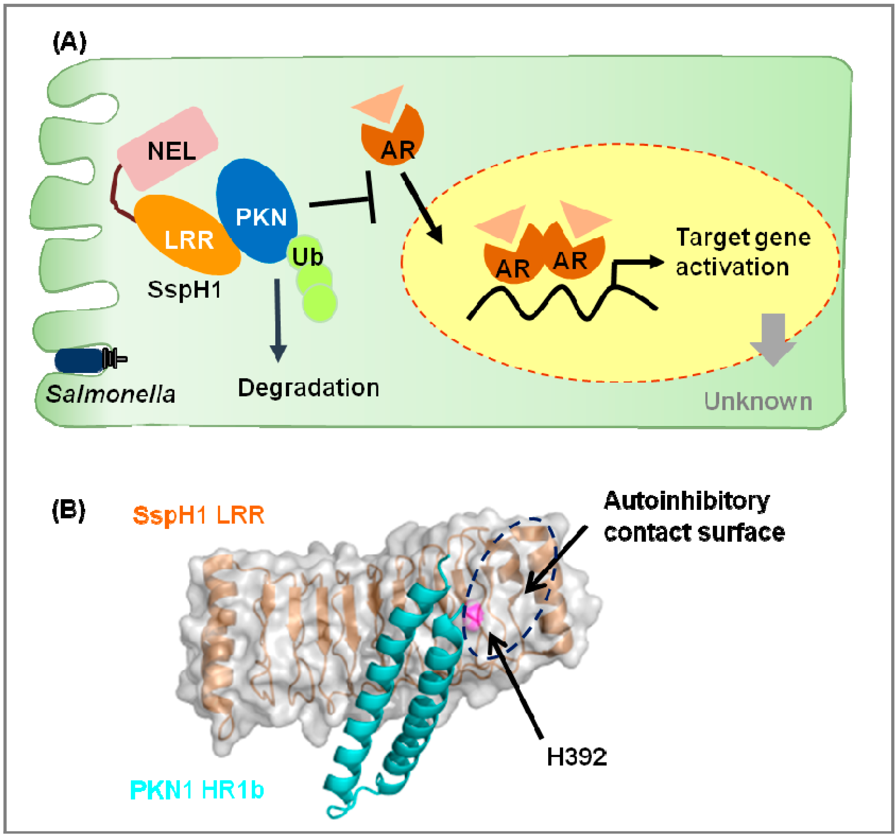 | SspH1 | PKN1 | Inhibition of androgen receptor signal | [36,37] | |||