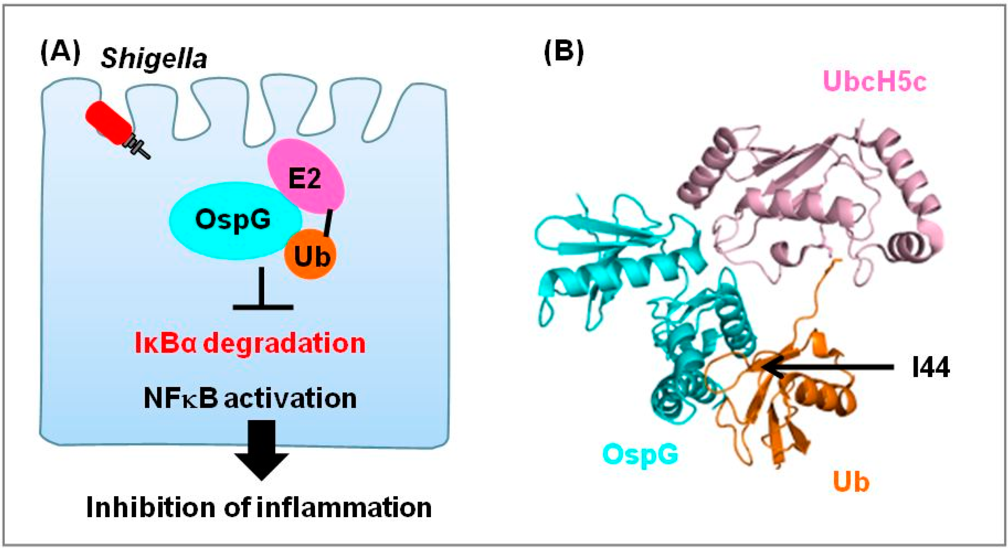 | Kinase | Shigella | OspG | UbcH5 | Suppression of inflammation | [46,47] | |