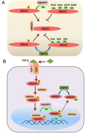 - Inui, M.; Manfrin, A.; Mamidi, A.; Martello, G.; Morsut, L.; Soligo, S.; Enzo, E.; Moro, S.; Polo, S.; Dupont, S.; et al. USP15 is a deubiquitylating enzyme for receptor-activated SMADs. Nat. Cell Biol. 2011, 13, 1368–1375. [Google Scholar] [CrossRef] [PubMed]