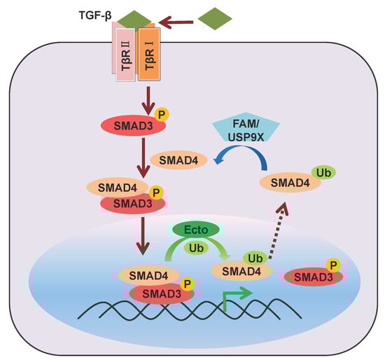 - Dupont, S.; Mamidi, A.; Cordenonsi, M.; Montagner, M.; Zacchigna, L.; Adorno, M.; Martello, G.; Stinchfield, M.J.; Soligo, S.; Morsut, L.; et al. FAM/USP9x, a deubiquitinating enzyme essential for TGFbeta signaling, controls Smad4 monoubiquitination. Cell 2009, 136, 123–135. [Google Scholar] [CrossRef] [PubMed]