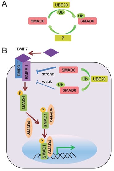 - Zhang, X.; Zhang, J.; Bauer, A.; Zhang, L.; Selinger, D.W.; Lu, C.X.; Ten Dijke, P. Fine-tuning BMP7 signalling in adipogenesis by UBE2O/E2-230K-mediated monoubiquitination of SMAD6. EMBO J. 2013, 32, 996–1007. [Google Scholar] [CrossRef] [PubMed]