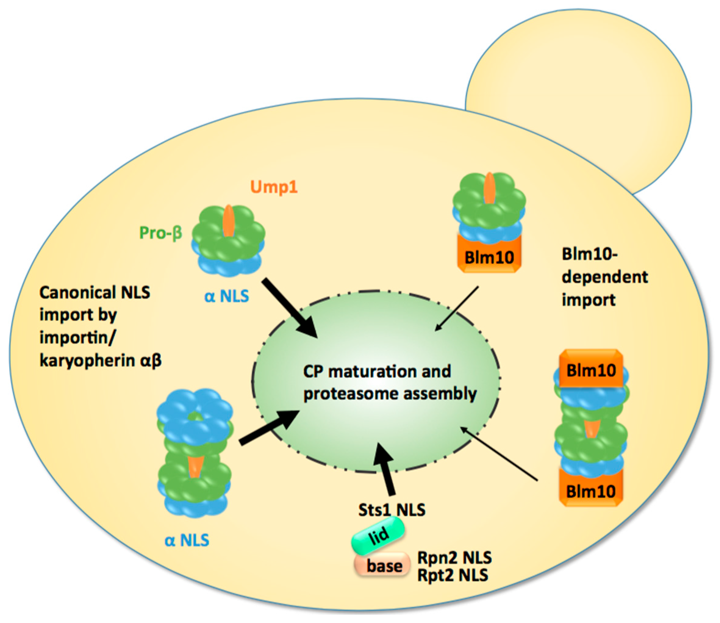 - Enenkel, C. Nuclear transport of yeast proteasomes. Biomolecules 2014, 4, 940–955. [Google Scholar] [CrossRef] [PubMed]