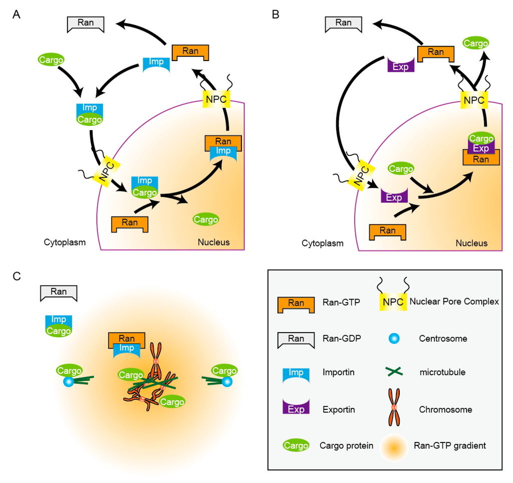 A cell is divided into two areas: the nucleus and the cytoplasm. The nuclear envelope serves as a spatial barrier to compartmentalize the nucleus from the rest of the cell. Various biomacromolecules including proteins and RNAs need to shuttle between the nucleus and the cytoplasm, across the nuclear envelope [7]. In the last two decades, a huge amount of research determined that Ran conducts the nucleocytoplasmic shuttling through the transport machinery, including importin and exportin [8,9,10,11,12].