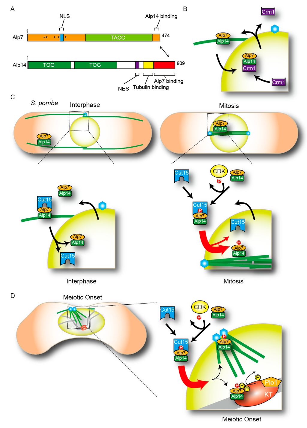 Nucleocytoplasmic shuttling of the Alp7-Alp14 complex in fission yeast. (A) Architectures of Alp7/TACC and Alp14/TOG. Alp7 has a nuclear localization signal (NLS) in its N-terminal half, whereas Alp7 interacts with Alp14 through its C-terminal end. Alp14 has a nuclear export signal (NES) in its middle region. Asterisks show the cyclin-dependent kinase (CDK) phosphorylation sites in Alp7. (B) The export of the Alp7-Alp14 complex. The NES in Alp14 plays a role in the nuclear export of the complex. (C) How the nuclear import of Alp7-Alp14 is modulated through the cell cycle. Left: During interphase, Alp7-Alp14 shuttles between the nucleus and the cytoplasm through the association of the NLS in Alp7 and importin-α/Cut15. Right: During mitosis, CDK phosphorylates Alp7 to accelerate the import activity of the complex and to promote spindle assembly. (D) Localization of Alp7-Alp14 at the onset of meiosis I. Alp7-Alp14 localizes to kinetochores (KT) even before microtubules that emanated from spindle pole bodies (SPBs) attach to the kinetochores.
