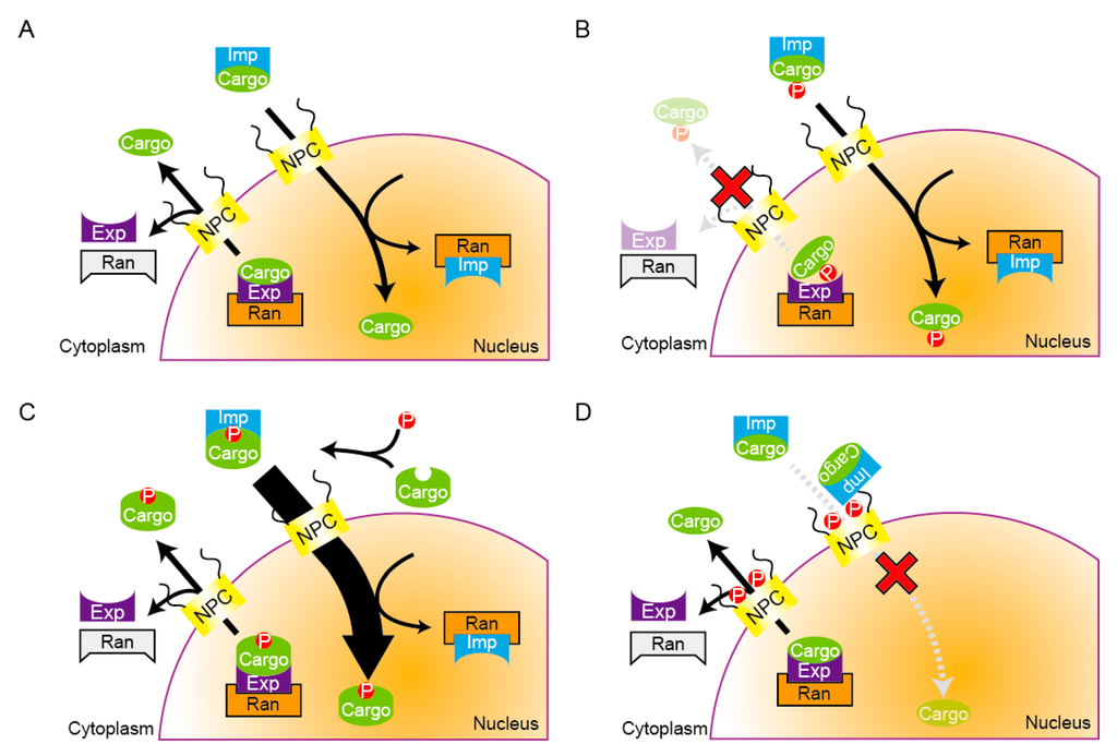 The last option is the regulation of transporters or Nups (Figure 3D). For example, in budding yeast, a nuclear pore complex protein, Nup53, changes its interaction with importin-β/Kap121 depending upon cell cycle stages [89,90]. In interphase, nucleoporins Nup53 and Nup170 interact with each other and locate inside the NPC. During mitosis, the phosphorylation of Nup53 by CDK dissociates Nup53 from Nup170, which unmasks Nup53’s interaction site for Kap121. Kap121 is then trapped to the NPC through the interaction with Nup53. As a result, the nuclear import via importin-β/Kap121 is repressed during mitosis. In another study using HeLa cells, Crm1/exportin is phosphorylated by CDK, which is required to form a complex with RanBP2 and RanGAP1 on spindle microtubules [91]. It is speculated that this complex enhances local GTP-hydrolysis of Ran-GTP on spindle microtubules, thereby promoting the dissociation of cargo proteins from Crm1 at the spindle.