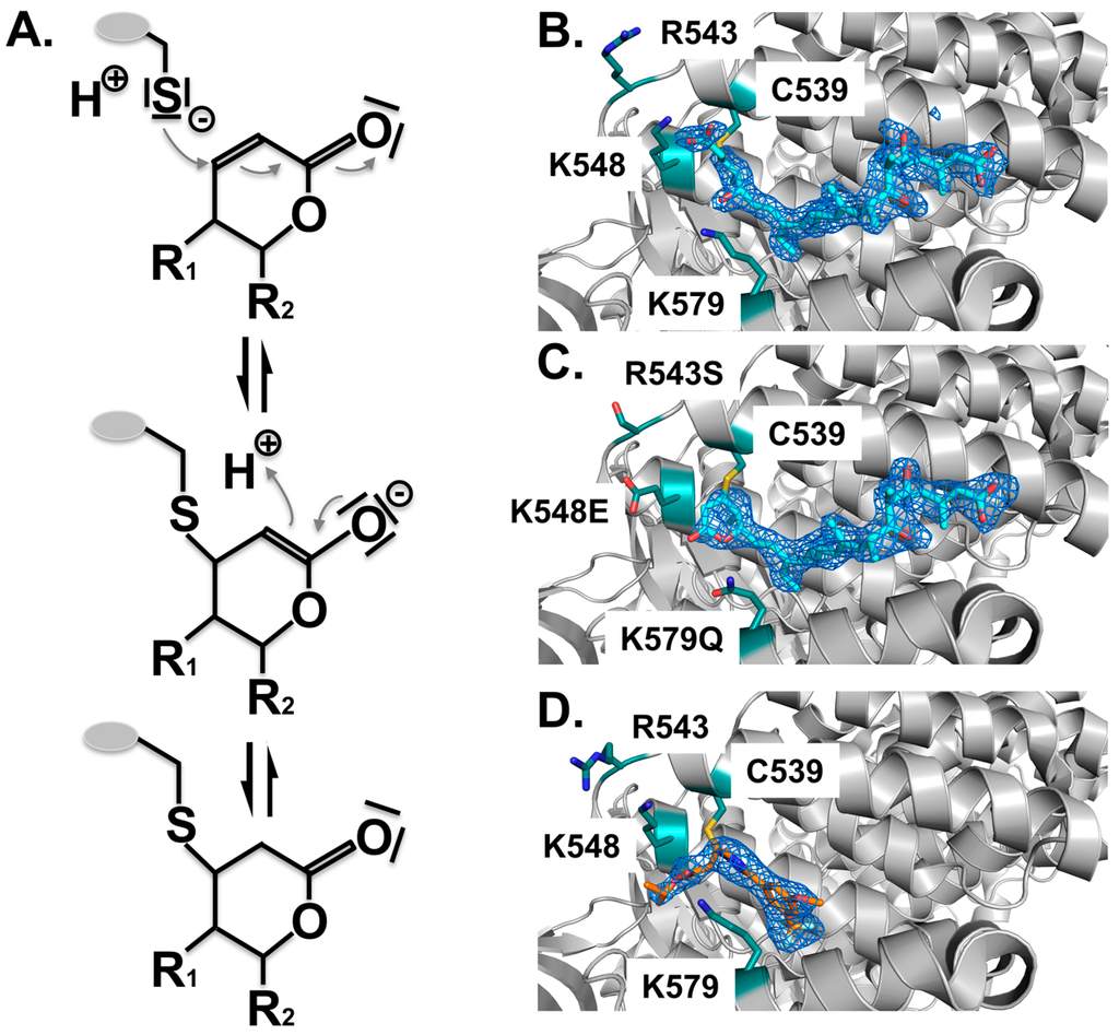 Covalent binding of inhibitors to the NES-binding cleft of CRM1. All inhibitors characterized thus far are covalently attached to the reactive cysteine C539 by a Michael-type addition. (A) Mechanism of the Michael addition of the cysteine to the lactone ring of CRM1 inhibitors. Subsequently, in the α,β-unsaturated δ-lactone ring containing compounds, a nucleophilic attack of a water molecule leads to lactone hydrolysis in a subsequent step due to the neighboring basic residues that form an oxyanion hole stabilizing the transition state of the reaction (not depicted). For compounds containing an α,β-unsaturated δ-lactone ring, binding is irreversible due to the CRM1-catalyzed opening of the lactone ring. Structural arrangement of the NES-binding cleft of CRM1 shown in cartoon mode (grey); (B) Binding of LMB (cyan) to CRM1 results in hydrolysis of the lactone ring due to neighboring basic residues indicated (teal). The mFo-DFc omit map contoured at a level of 3.0 sigma, clearly shows the arrangement of the hydrolyzed LMB; (C) Mutation of the three basic residues prevents ring opening of LMB (cyan); (D) By contrast, binding of the novel compounds lacking the lactone ring, is slowly reversible. KPT185 interacts with Cys528, but no other changes are observed.