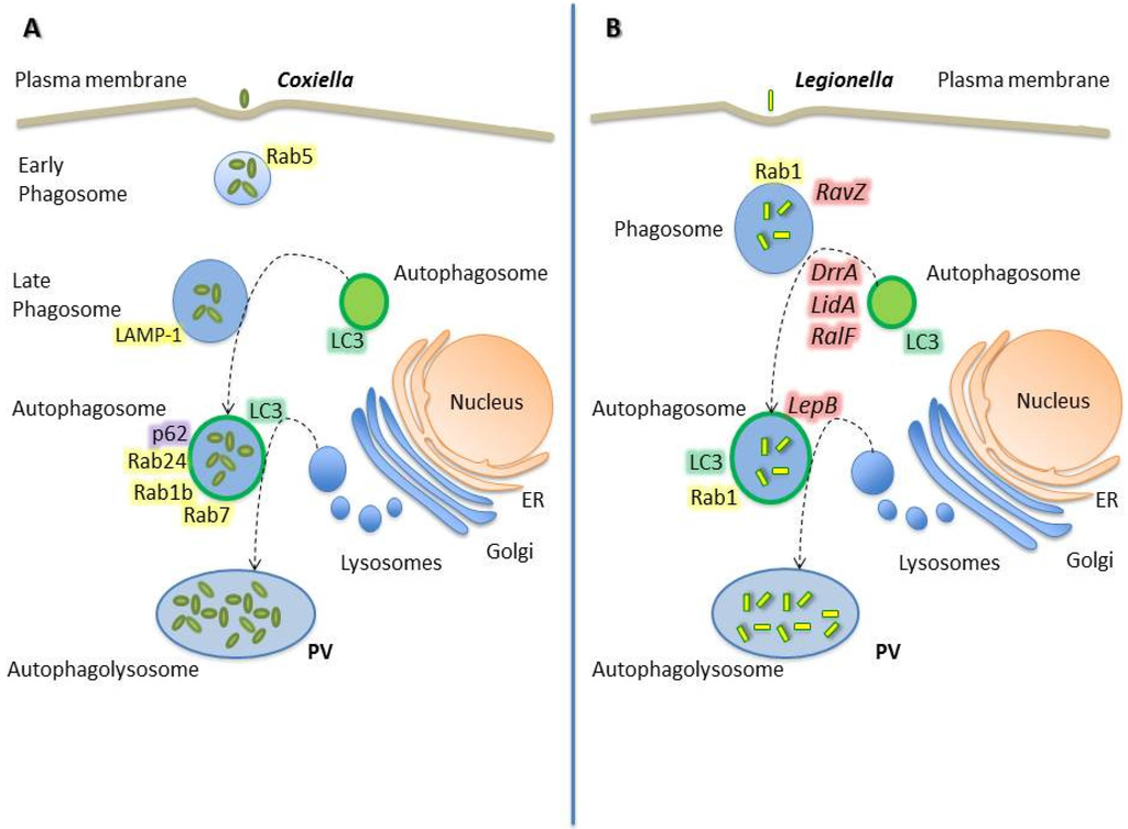 - Colombo, M.I.; Gutierrez, M.G.; Romano, P.S. The two faces of autophagy: Coxiella and Mycobacterium. Autophagy 2006, 2, 162–164. [Google Scholar] [CrossRef] [PubMed]